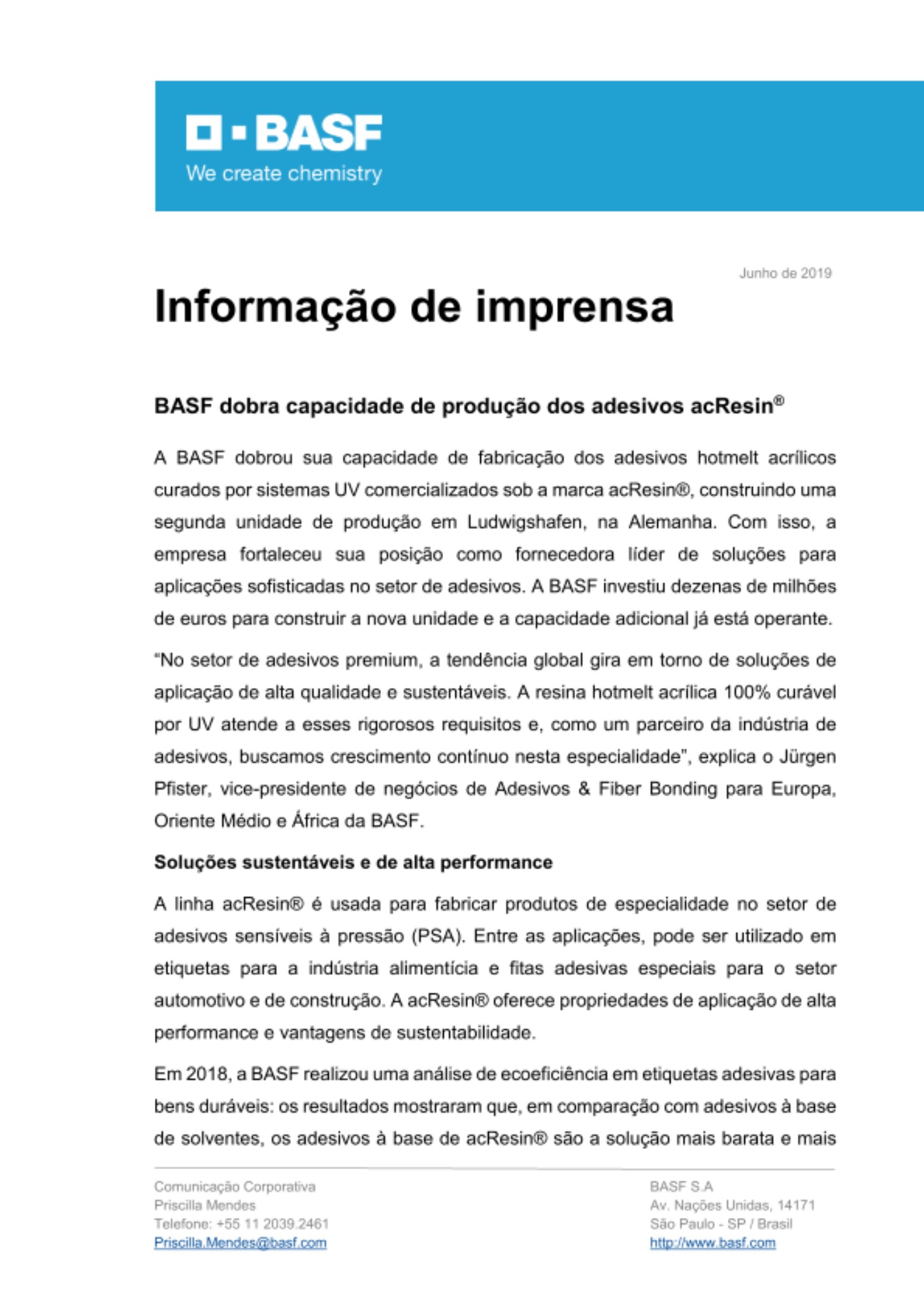 A BASF dobrou sua capacidade de fabricação dos adesivos hotmelt acrílicos curados por sistemas UV comercializados sob a marca acResin®, construindo uma segunda unidade de produção em Ludwigshafen, na Alemanha. Com isso, a empresa fortaleceu sua posição como fornecedora líder de soluções para aplicações sofisticadas no setor de adesivos. A BASF investiu dezenas de milhões de euros para construir a nova unidade e a capacidade adicional já está operante.