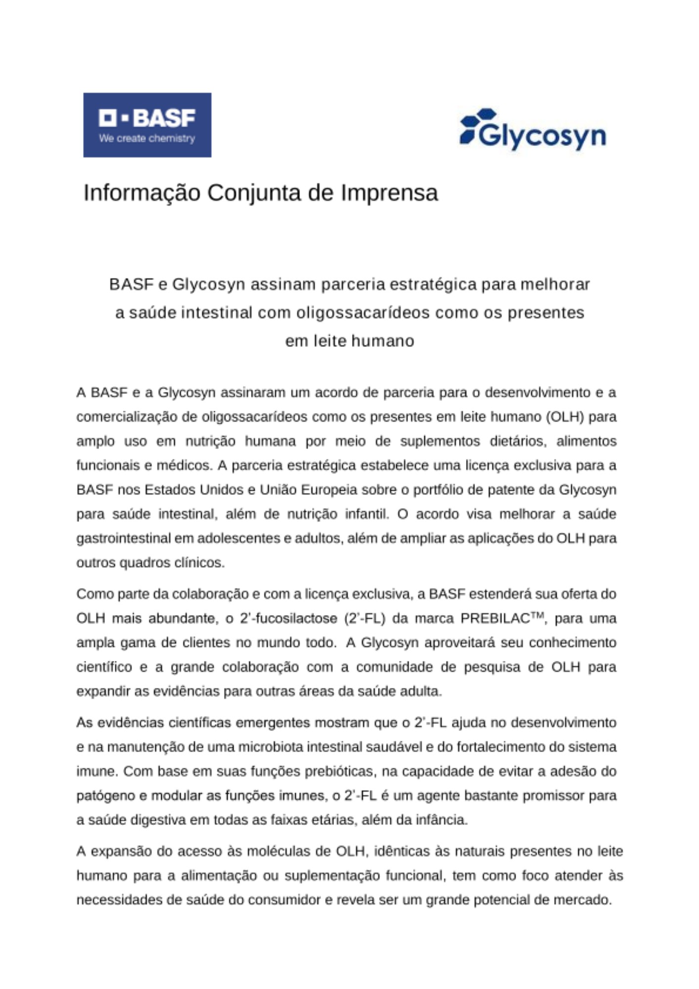 Como parte da colaboração e com a licença exclusiva, a BASF estenderá sua oferta do OLH mais abundante, o 2’-fucosilactose (2’-FL) da marca PREBILACTM, para uma ampla gama de clientes no mundo todo. A Glycosyn aproveitará seu conhecimento científico e a grande colaboração com a comunidade de pesquisa de OLH para expandir as evidências para outras áreas da saúde adulta.