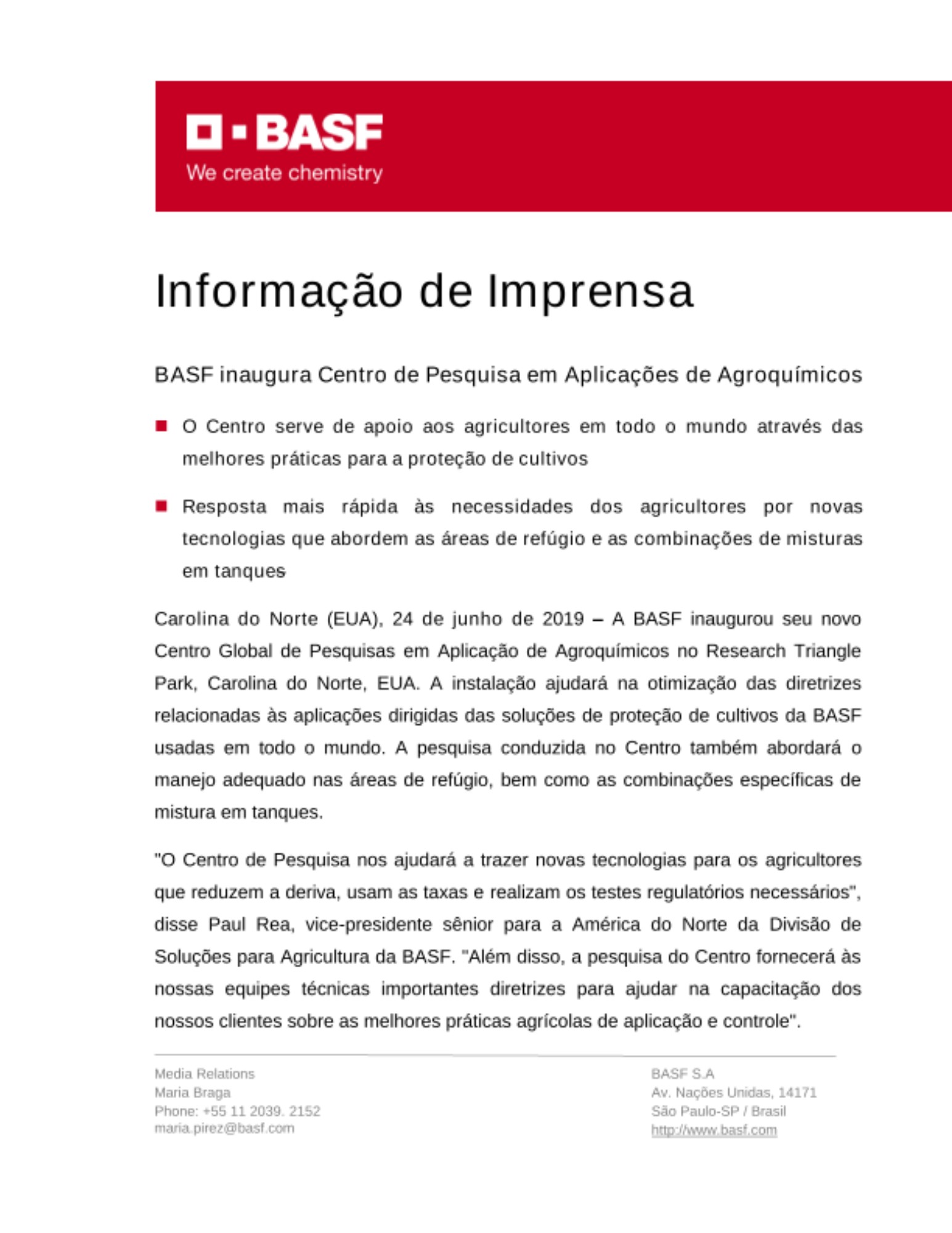 "O Centro de Pesquisa nos ajudará a trazer novas tecnologias para os agricultores que reduzem a deriva, usam as taxas e realizam os testes regulatórios necessários", disse Paul Rea, vice-presidente sênior para a América do Norte da Divisão de Soluções para Agricultura da BASF. "Além disso, a pesquisa do Centro fornecerá às nossas equipes técnicas importantes diretrizes para ajudar na capacitação dos nossos clientes sobre as melhores práticas agrícolas de aplicação e controle".