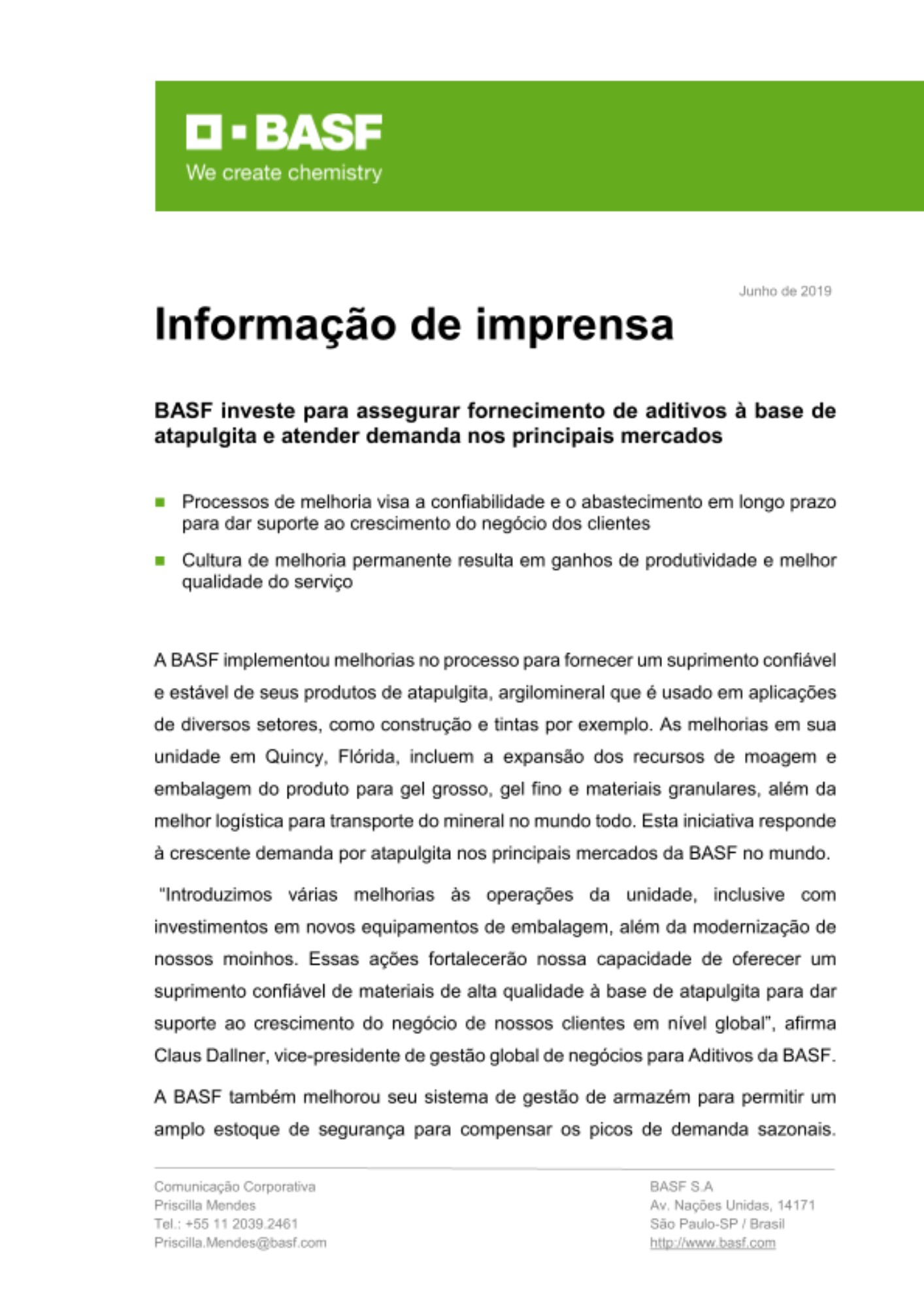 A BASF implementou melhorias no processo para fornecer um suprimento confiável e estável de seus produtos de atapulgita, argilomineral que é usado em aplicações de diversos setores, como construção e tintas por exemplo. As melhorias em sua unidade em Quincy, Flórida, incluem a expansão dos recursos de moagem e embalagem do produto para gel grosso, gel fino e materiais granulares, além da melhor logística para transporte do mineral no mundo todo. Esta iniciativa responde à crescente demanda por atapulgita nos principais mercados da BASF no mundo.