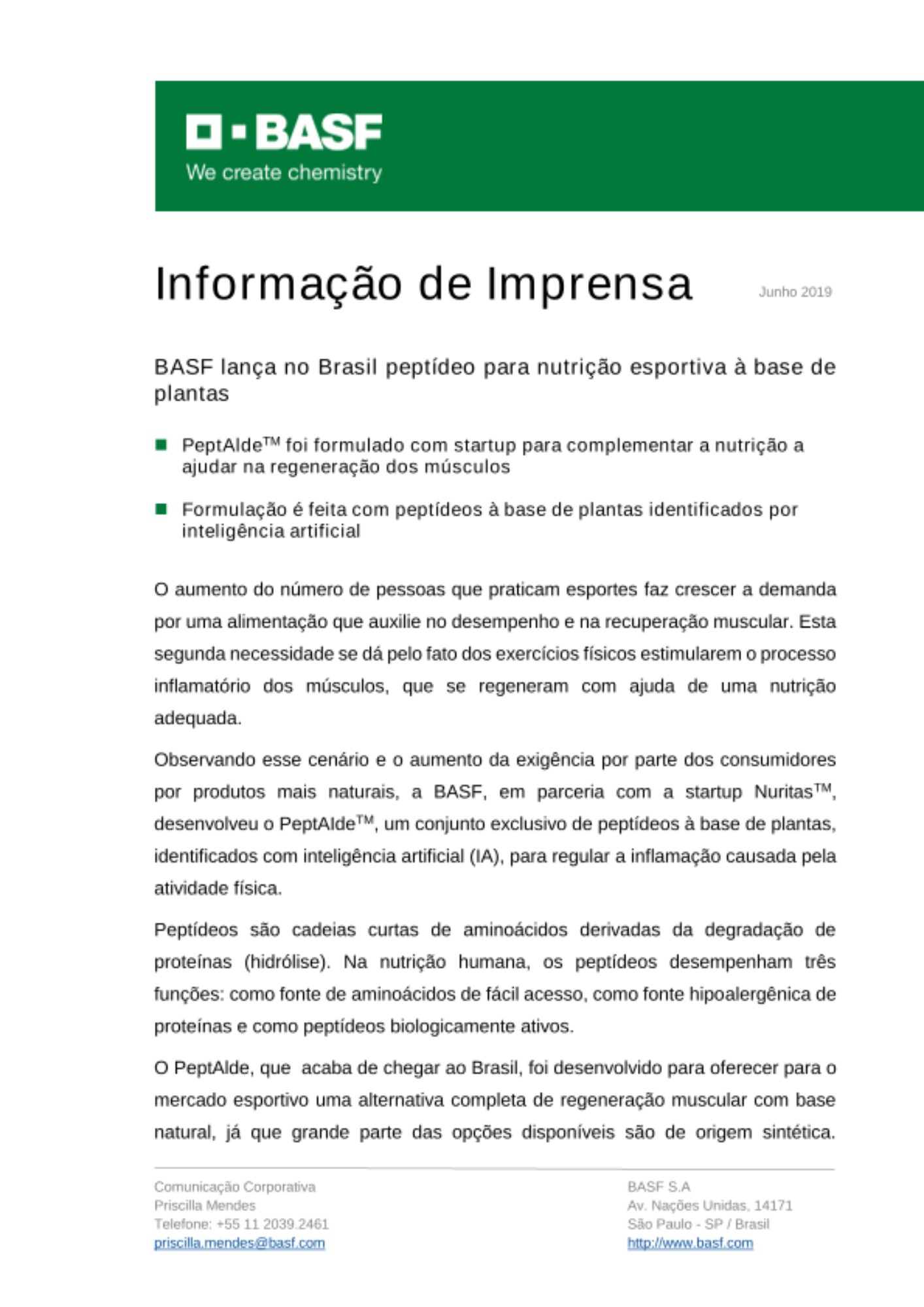 Observando esse cenário e o aumento da exigência por parte dos consumidores por produtos mais naturais, a BASF, em parceria com a startup NuritasTM, desenvolveu o PeptAIdeTM, um conjunto exclusivo de peptídeos à base de plantas, identificados com inteligência artificial (IA), para regular a inflamação causada pela atividade física.