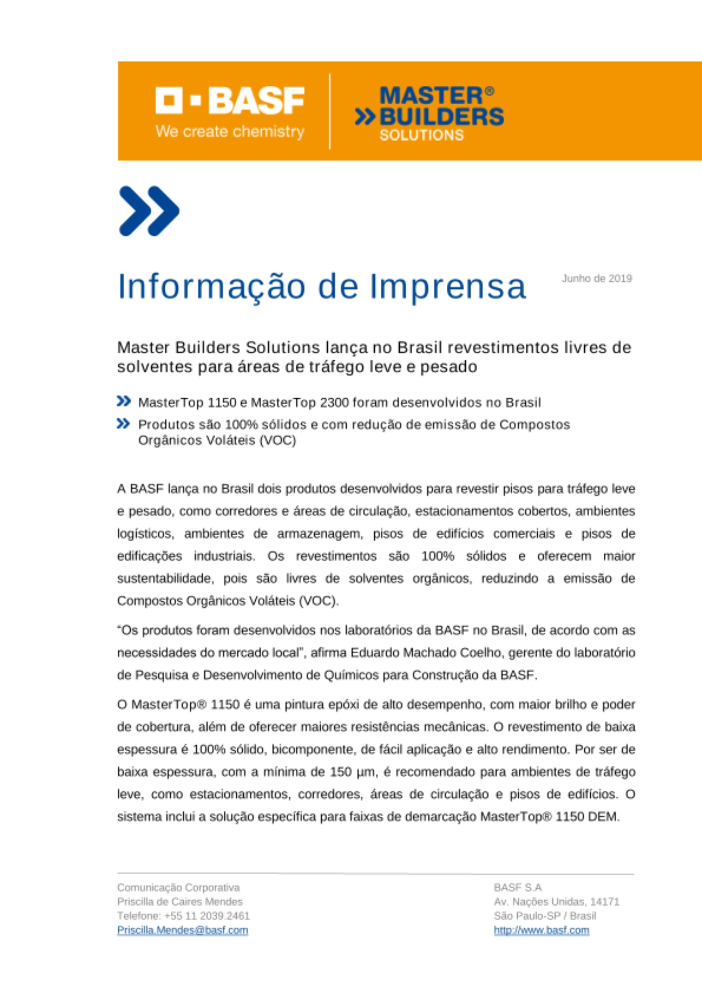 A BASF lança no Brasil dois produtos desenvolvidos para revestir pisos para tráfego leve e pesado, como corredores e áreas de circulação, estacionamentos cobertos, ambientes logísticos, ambientes de armazenagem, pisos de edifícios comerciais e pisos de edificações industriais. Os revestimentos são 100% sólidos e oferecem maior sustentabilidade, pois são livres de solventes orgânicos, reduzindo a emissão de Compostos Orgânicos Voláteis (VOC).