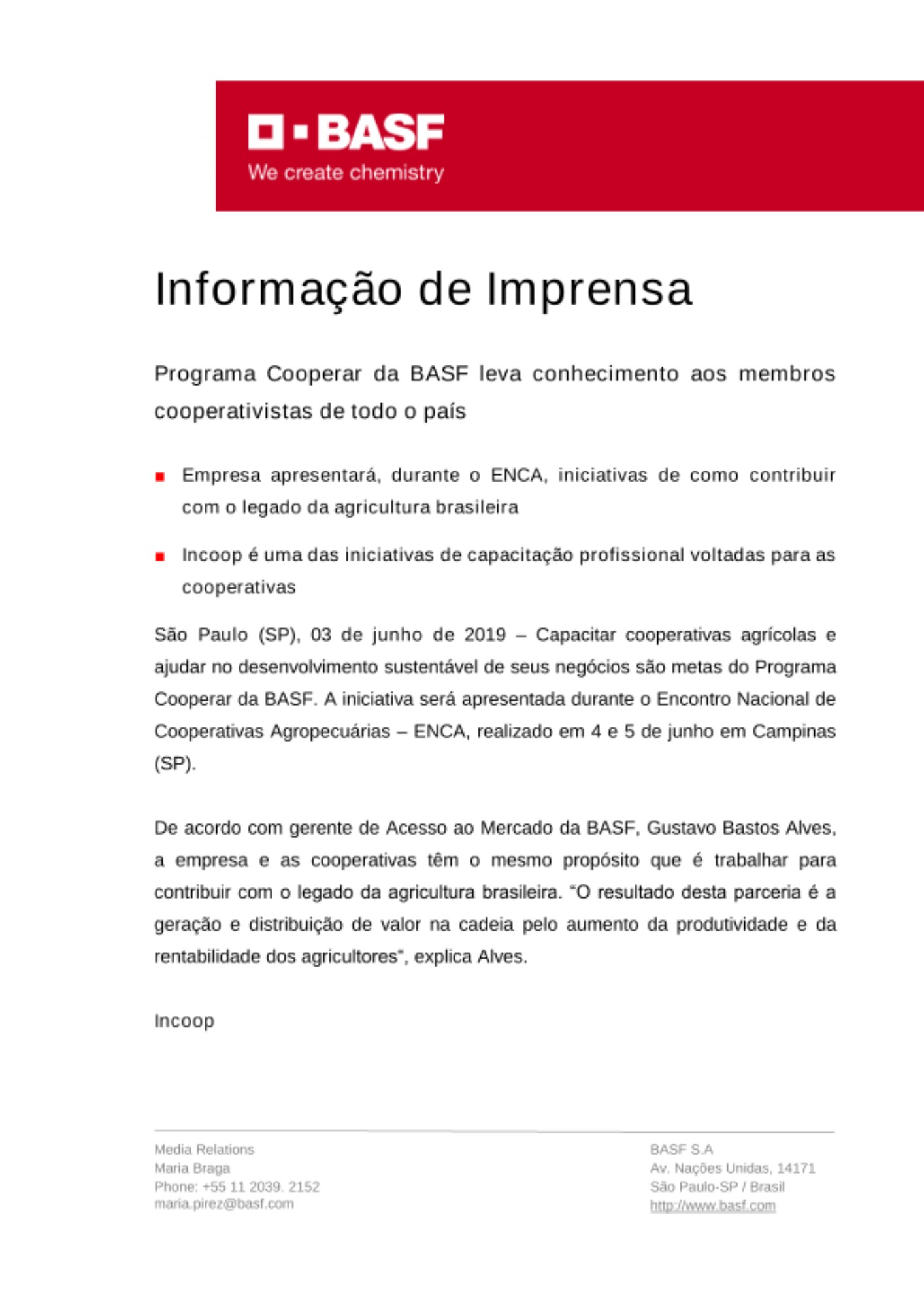 São Paulo (SP), 03 de junho de 2019 – Capacitar cooperativas agrícolas e ajudar no desenvolvimento sustentável de seus negócios são metas do Programa Cooperar da BASF. A iniciativa será apresentada durante o Encontro Nacional de Cooperativas Agropecuárias – ENCA, realizado em 4 e 5 de junho em Campinas (SP).