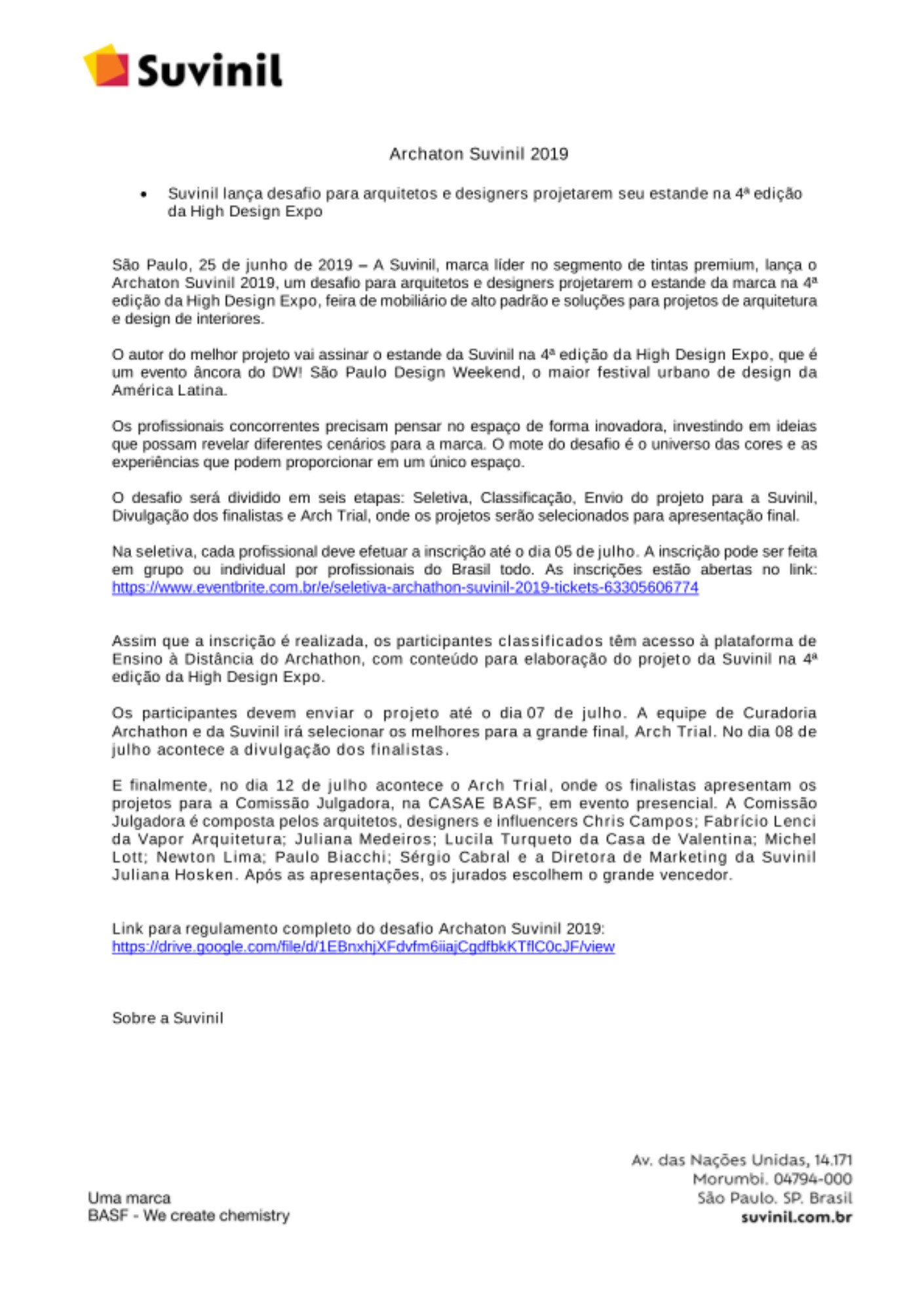 São Paulo, 25 de junho de 2019 – A Suvinil, marca líder no segmento de tintas premium, lança o Archaton Suvinil 2019, um desafio para arquitetos e designers projetarem o estande da marca na 4ª edição da High Design Expo, feira de mobiliário de alto padrão e soluções para projetos de arquitetura e design de interiores.