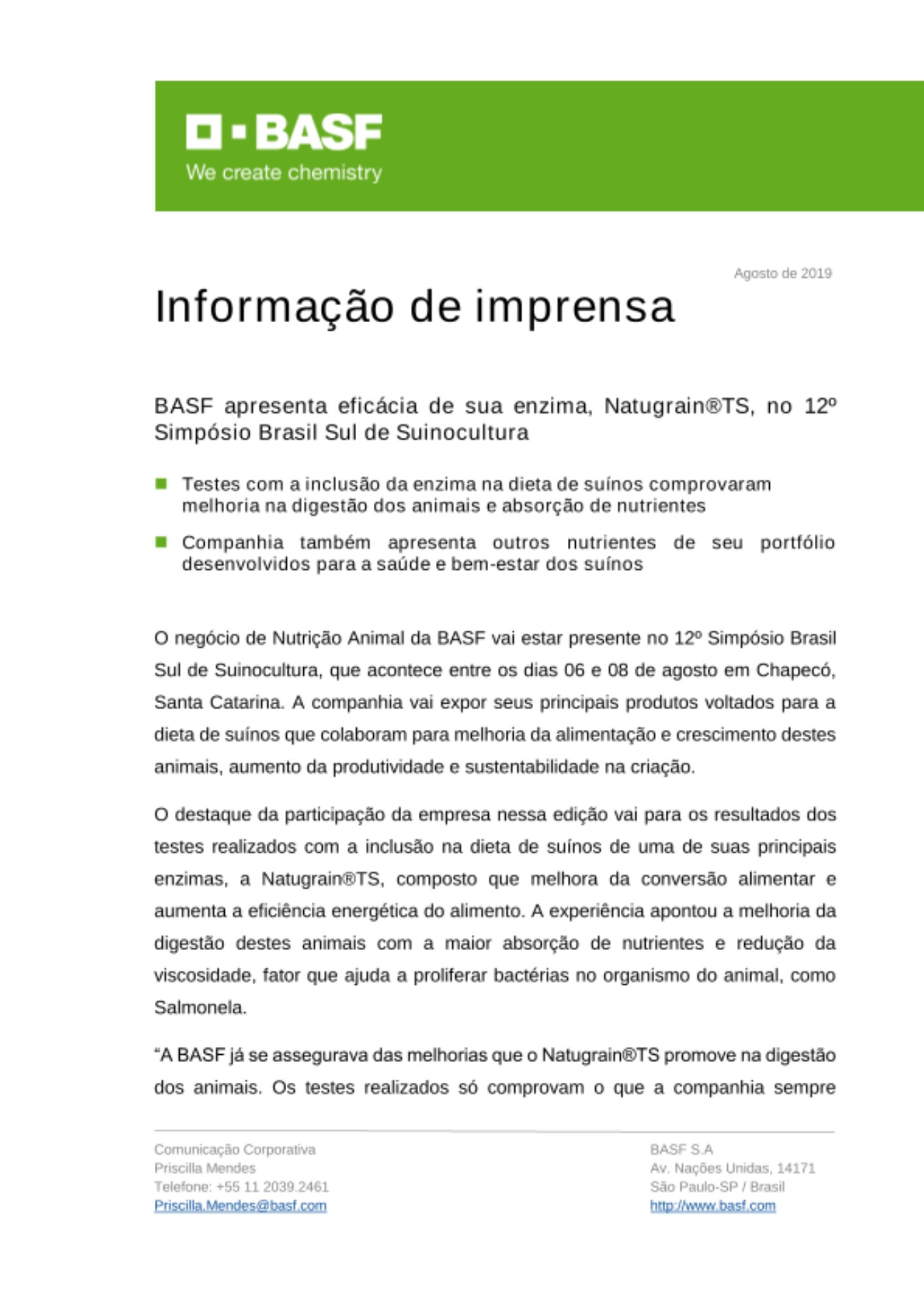 BASF apresenta eficácia de sua enzima, Natugrain®TS, no 12º Simpósio Brasil Sul de Suinocultura