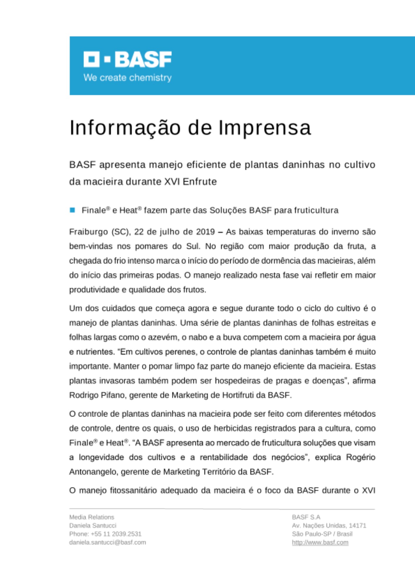 Prezado jornalista, favor contatar a BASF, por meio de sua área da Comunicação Corporativa, em caso de informações sobre os produtos e sua correta aplicação. Uso exclusivamente agrícola. Aplique somente as doses recomendadas. Descarte corretamente as embalagens e restos de produtos. Incluir outros métodos de controle do programa do Manejo Integrado de Pragas (MIP) quando disponíveis e apropriados. Os produtos Finale®, Heat® e Dormex® estão devidamente registrado no Ministério da Agricultura, Pecuária e Abastecimento sob os números: 000691, 01013 e o 001095.