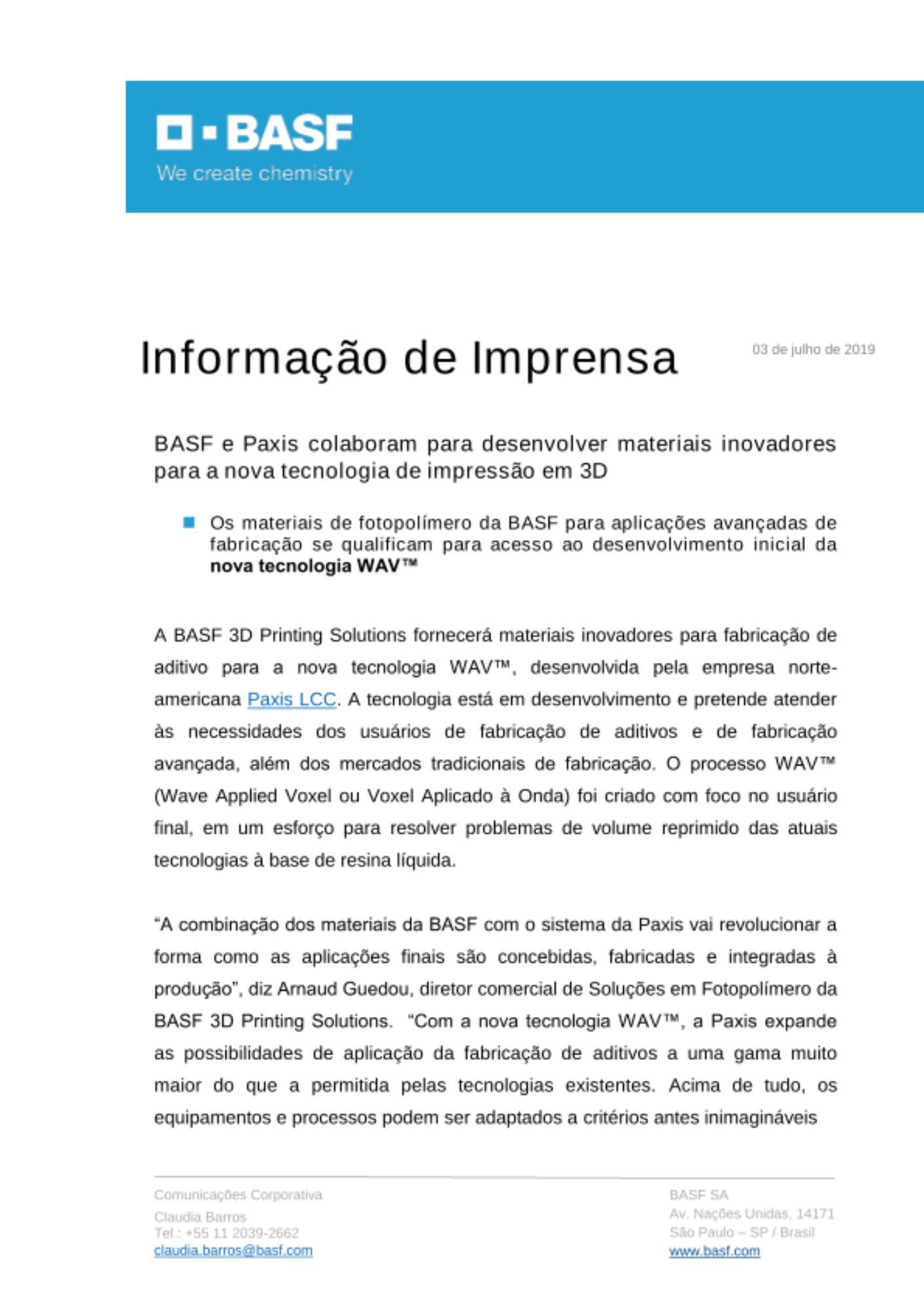 A BASF 3D Printing Solutions fornecerá materiais inovadores para fabricação de aditivo para a nova tecnologia WAV™, desenvolvida pela empresa norte-americana Paxis LCC. A tecnologia está em desenvolvimento e pretende atender às necessidades dos usuários de fabricação de aditivos e de fabricação avançada, além dos mercados tradicionais de fabricação. O processo WAV™ (Wave Applied Voxel ou Voxel Aplicado à Onda) foi criado com foco no usuário final, em um esforço para resolver problemas de volume reprimido das atuais tecnologias à base de resina líquida.