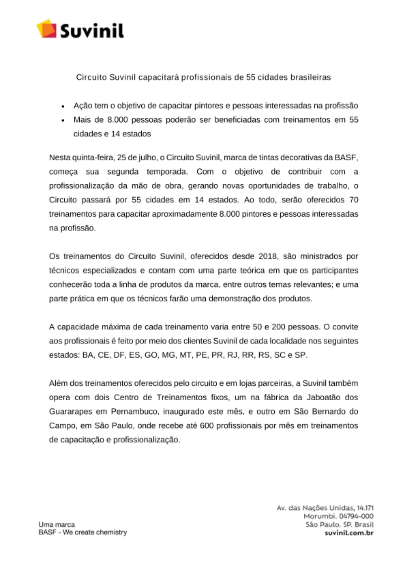Nesta quinta-feira, 25 de julho, o Circuito Suvinil, marca de tintas decorativas da BASF, começa sua segunda temporada. Com o objetivo de contribuir com a profissionalização da mão de obra, gerando novas oportunidades de trabalho, o Circuito passará por 55 cidades em 14 estados. Ao todo, serão oferecidos 70 treinamentos para capacitar aproximadamente 8.000 pintores e pessoas interessadas na profissão.
