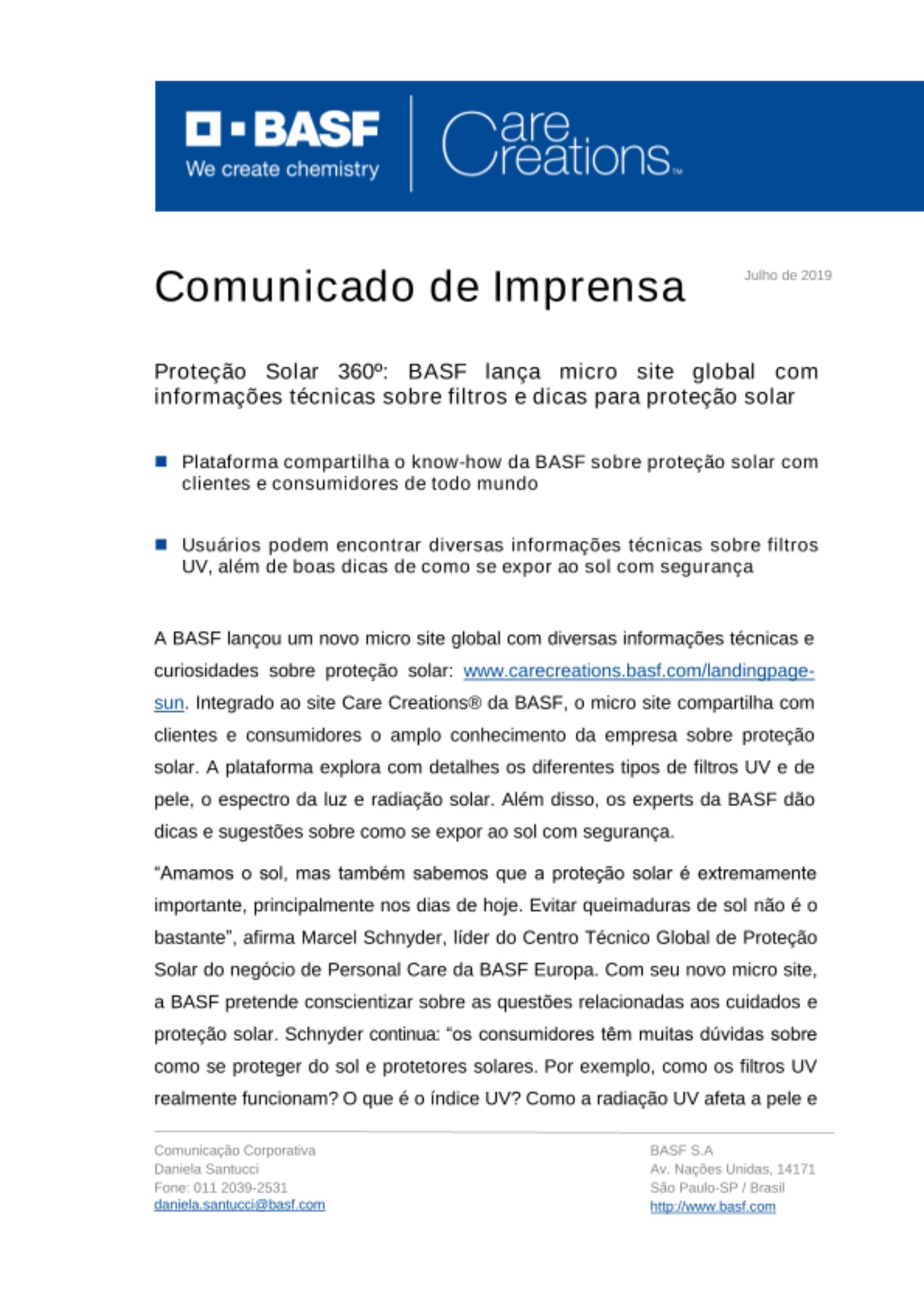 A BASF lançou um novo micro site global com diversas informações técnicas e curiosidades sobre proteção solar: www.carecreations.basf.com/landingpage-sun. Integrado ao site Care Creations® da BASF, o micro site compartilha com clientes e consumidores o amplo conhecimento da empresa sobre proteção solar. A plataforma explora com detalhes os diferentes tipos de filtros UV e de pele, o espectro da luz e radiação solar. Além disso, os experts da BASF dão dicas e sugestões sobre como se expor ao sol com segurança.