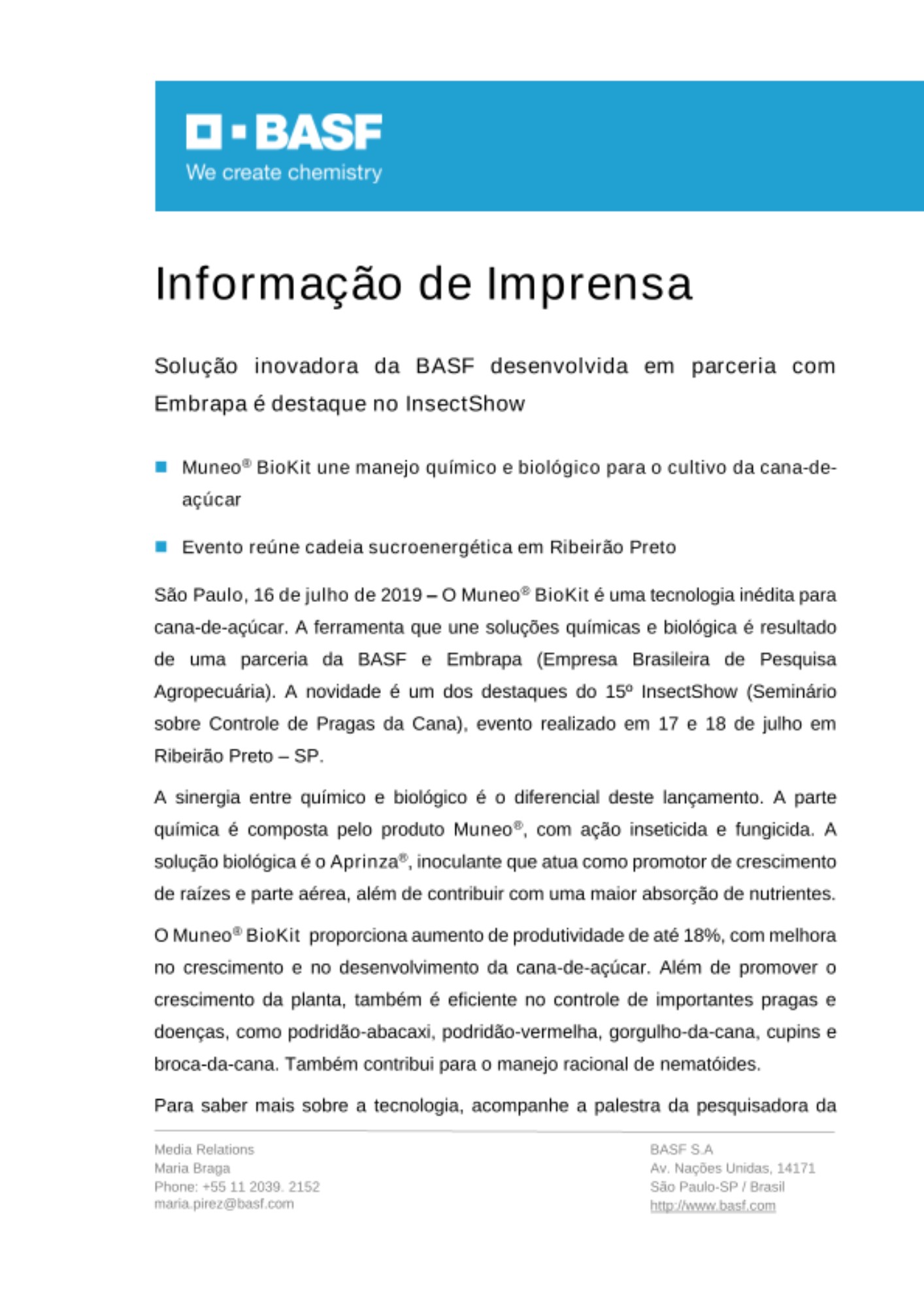 São Paulo, 16 de julho de 2019 – O Muneo® BioKit é uma tecnologia inédita para cana-de-açúcar. A ferramenta que une soluções químicas e biológica é resultado de uma parceria da BASF e Embrapa (Empresa Brasileira de Pesquisa Agropecuária). A novidade é um dos destaques do 15º InsectShow (Seminário sobre Controle de Pragas da Cana), evento realizado em 17 e 18 de julho em Ribeirão Preto – SP.