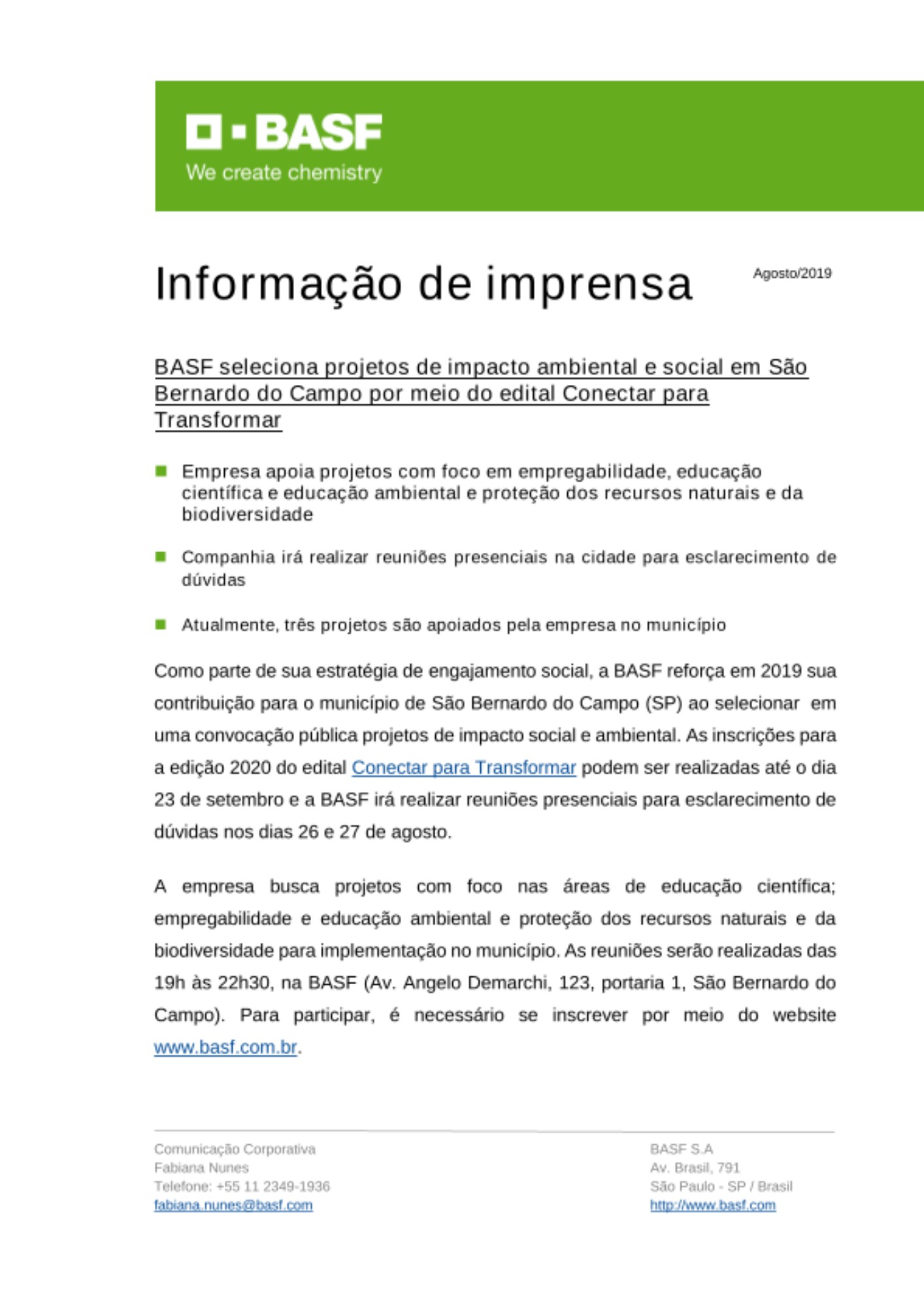 Como parte de sua estratégia de engajamento social, a BASF reforça em 2019 sua contribuição para o município de São Bernardo do Campo (SP) ao selecionar em uma convocação pública projetos de impacto social e ambiental. As inscrições para a edição 2020 do edital Conectar para Transformar podem ser realizadas até o dia 23 de setembro e a BASF irá realizar reuniões presenciais para esclarecimento de dúvidas nos dias 26 e 27 de agosto.