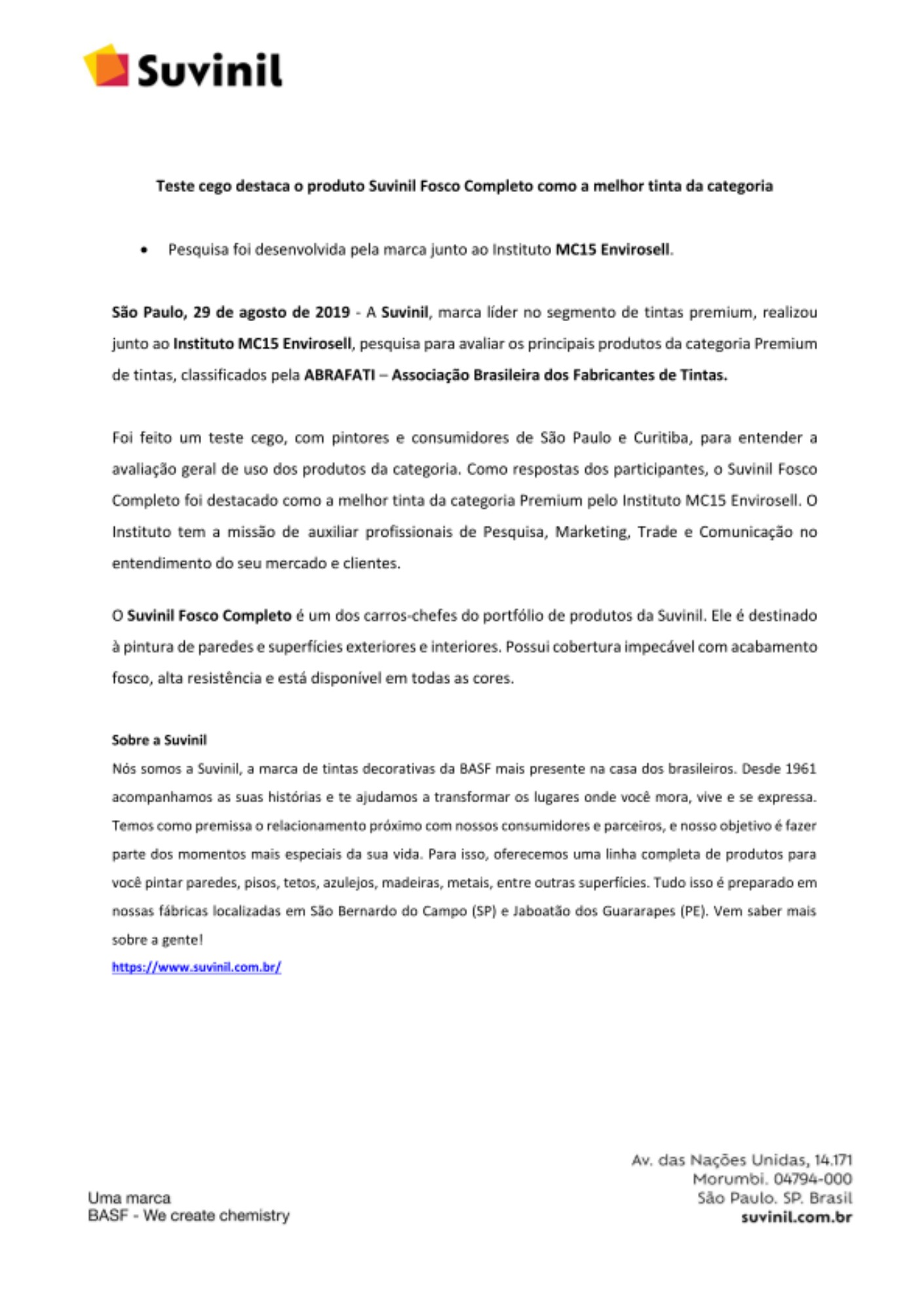 Foi feito um teste cego, com pintores e consumidores de São Paulo e Curitiba, para entender a avaliação geral de uso dos produtos da categoria. Como respostas dos participantes, o Suvinil Fosco Completo foi destacado como a melhor tinta da categoria Premium pelo Instituto MC15 Envirosell. O Instituto tem a missão de auxiliar profissionais de Pesquisa, Marketing, Trade e Comunicação no entendimento do seu mercado e clientes.