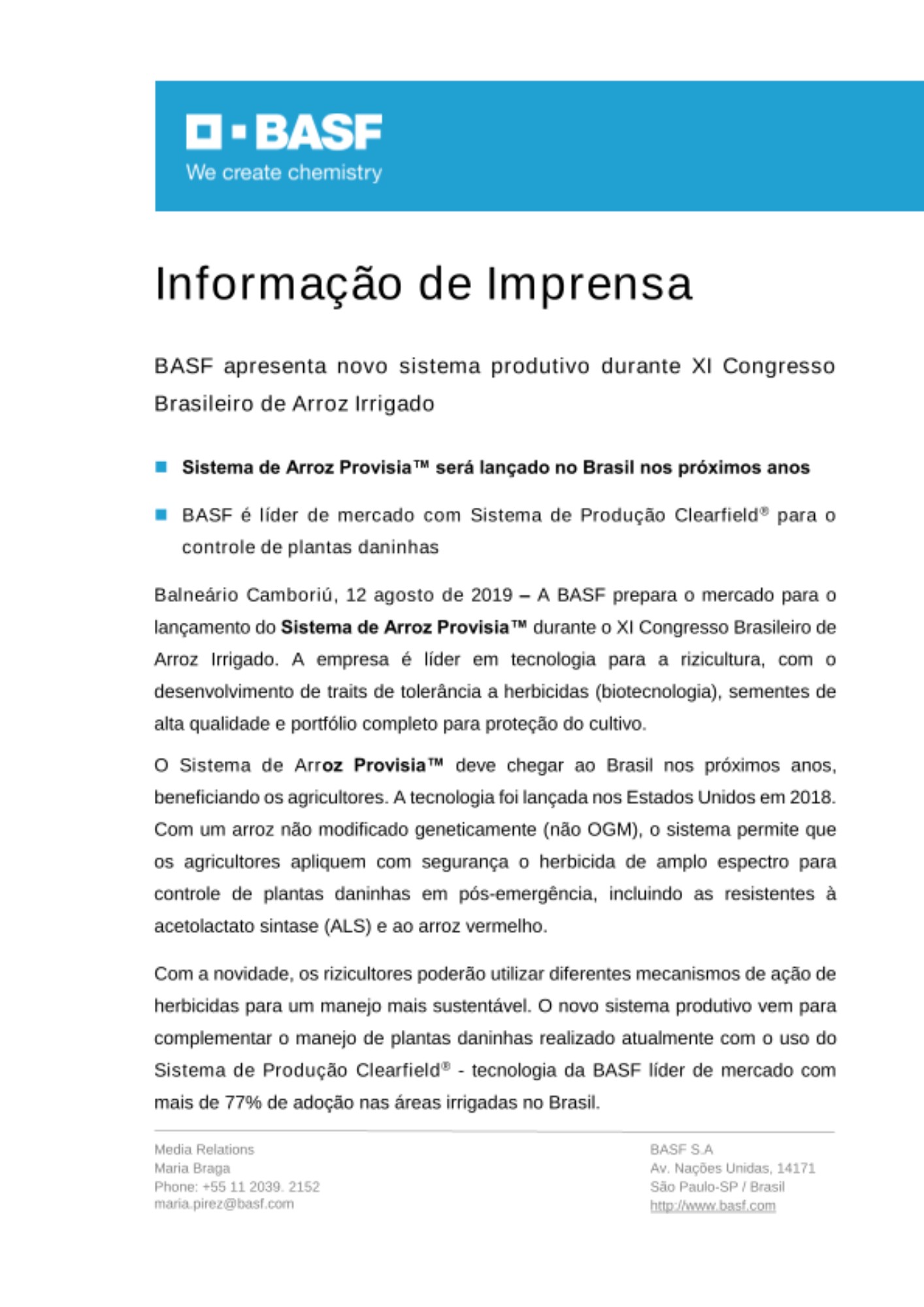 Balneário Camboriú, 12 agosto de 2019 – A BASF prepara o mercado para o lançamento do Sistema de Arroz Provisia™ durante o XI Congresso Brasileiro de Arroz Irrigado. A empresa é líder em tecnologia para a rizicultura, com o desenvolvimento de traits de tolerância a herbicidas (biotecnologia), sementes de alta qualidade e portfólio completo para proteção do cultivo.