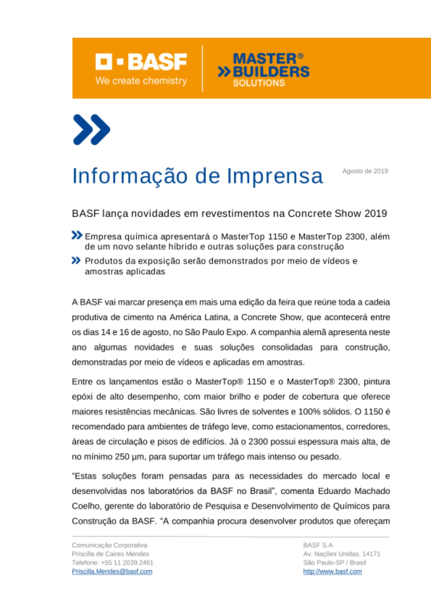 “Estas soluções foram pensadas para as necessidades do mercado local e desenvolvidas nos laboratórios da BASF no Brasil”, comenta Eduardo Machado Coelho, gerente do laboratório de Pesquisa e Desenvolvimento de Químicos para Construção da BASF. “A companhia procura desenvolver produtos que ofereçam inovação e eficiência aos seus clientes e, ao mesmo tempo, utilizem menos recursos naturais, uma vez que a sustentabilidade é uma das principais diretrizes da empresa”, explica.