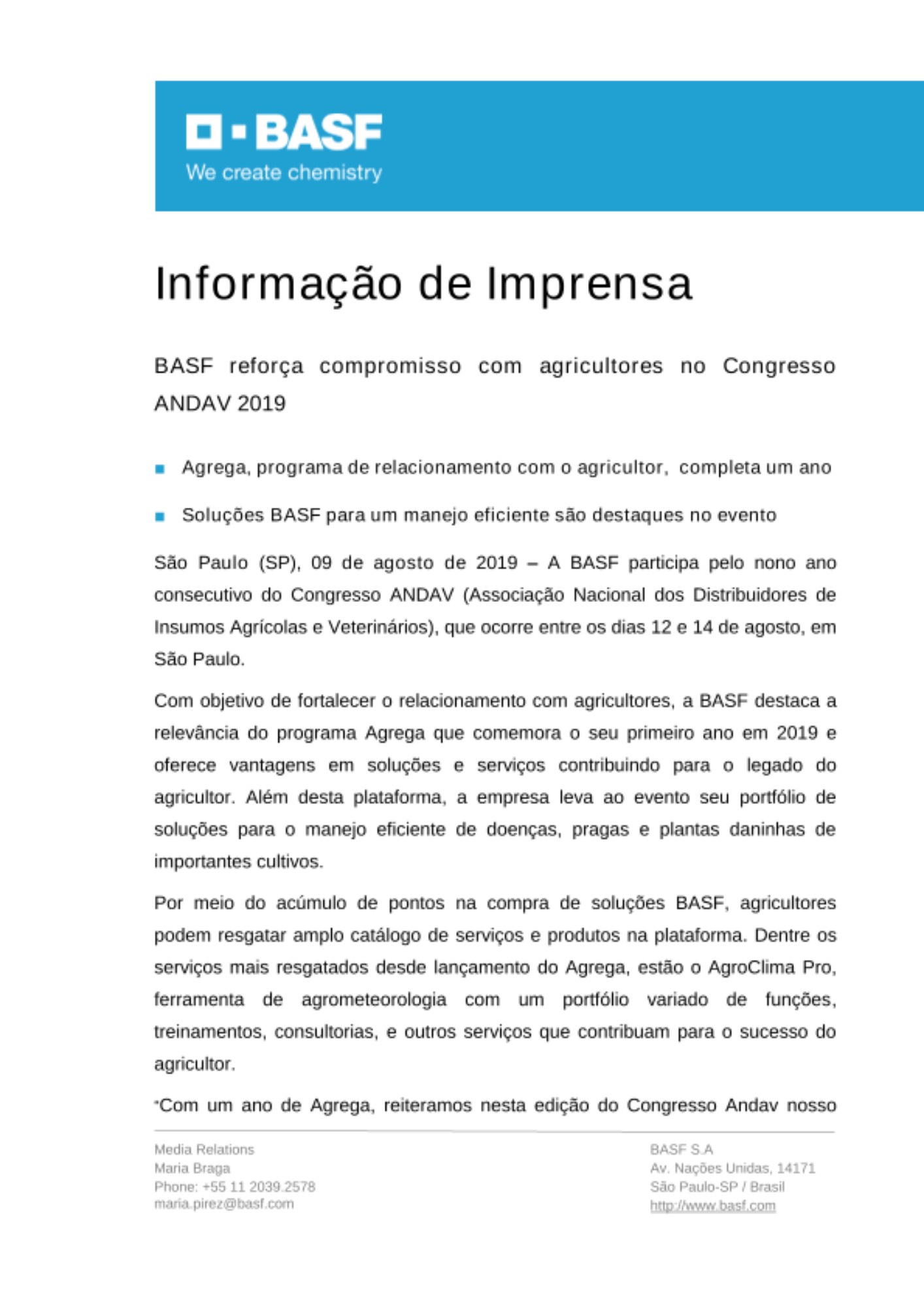 “Com um ano de Agrega, reiteramos nesta edição do Congresso Andav nosso compromisso em oferecer soluções adequadas às necessidades dos diferentes perfis de agricultores, contribuindo cada vez mais para a produtividade e longevidade de seus negócios.” comenta Mario Lavacca, gerente sênior de Acesso ao Mercado e Gestão de Clientes da BASF.