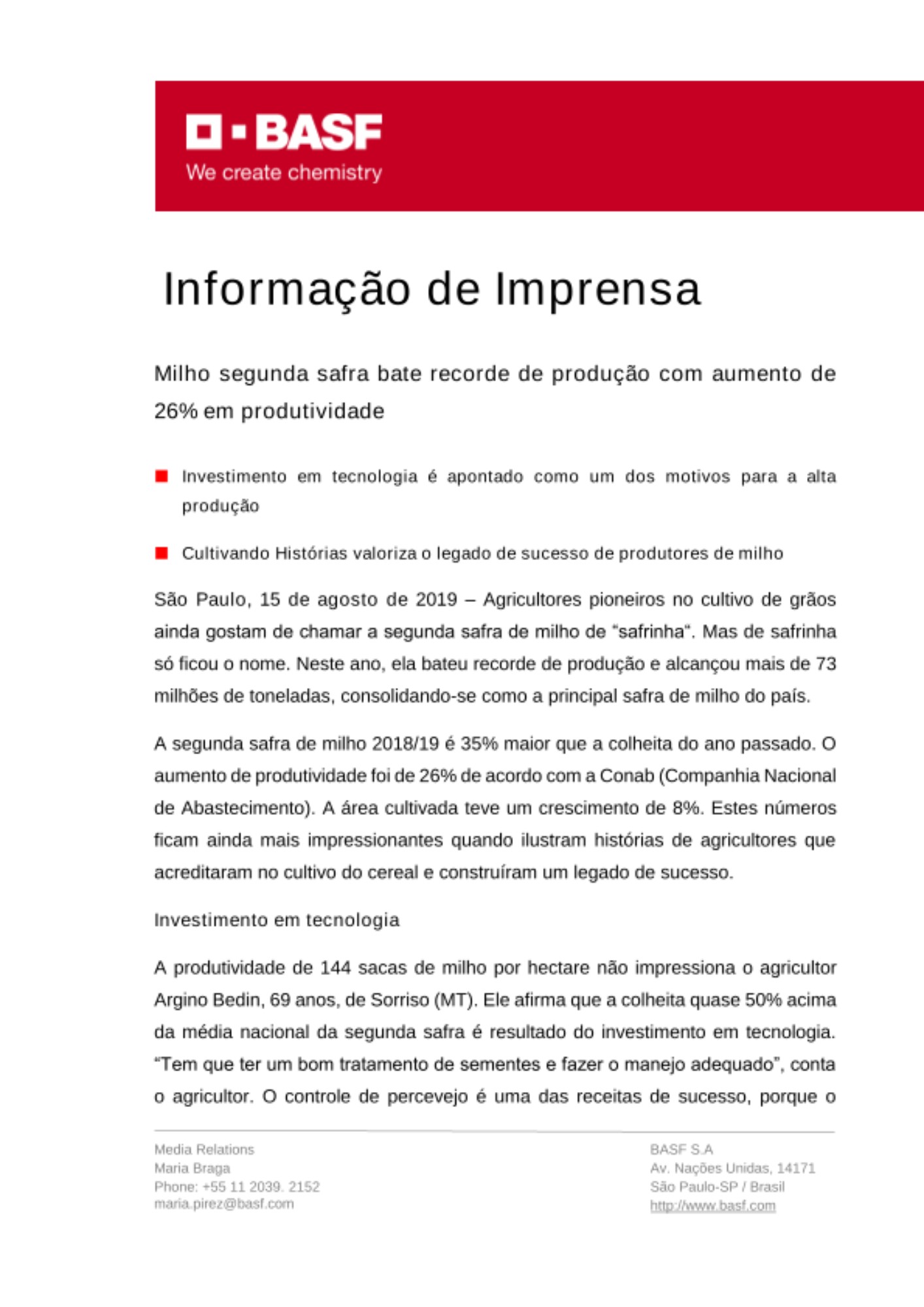 A produtividade de 144 sacas de milho por hectare não impressiona o agricultor Argino Bedin, 69 anos, de Sorriso (MT). Ele afirma que a colheita quase 50% acima da média nacional da segunda safra é resultado do investimento em tecnologia. “Tem que ter um bom tratamento de sementes e fazer o manejo adequado”, conta o agricultor. O controle de percevejo é uma das receitas de sucesso, porque o inseto tem sido “bem agressivo”, segundo Bedin.