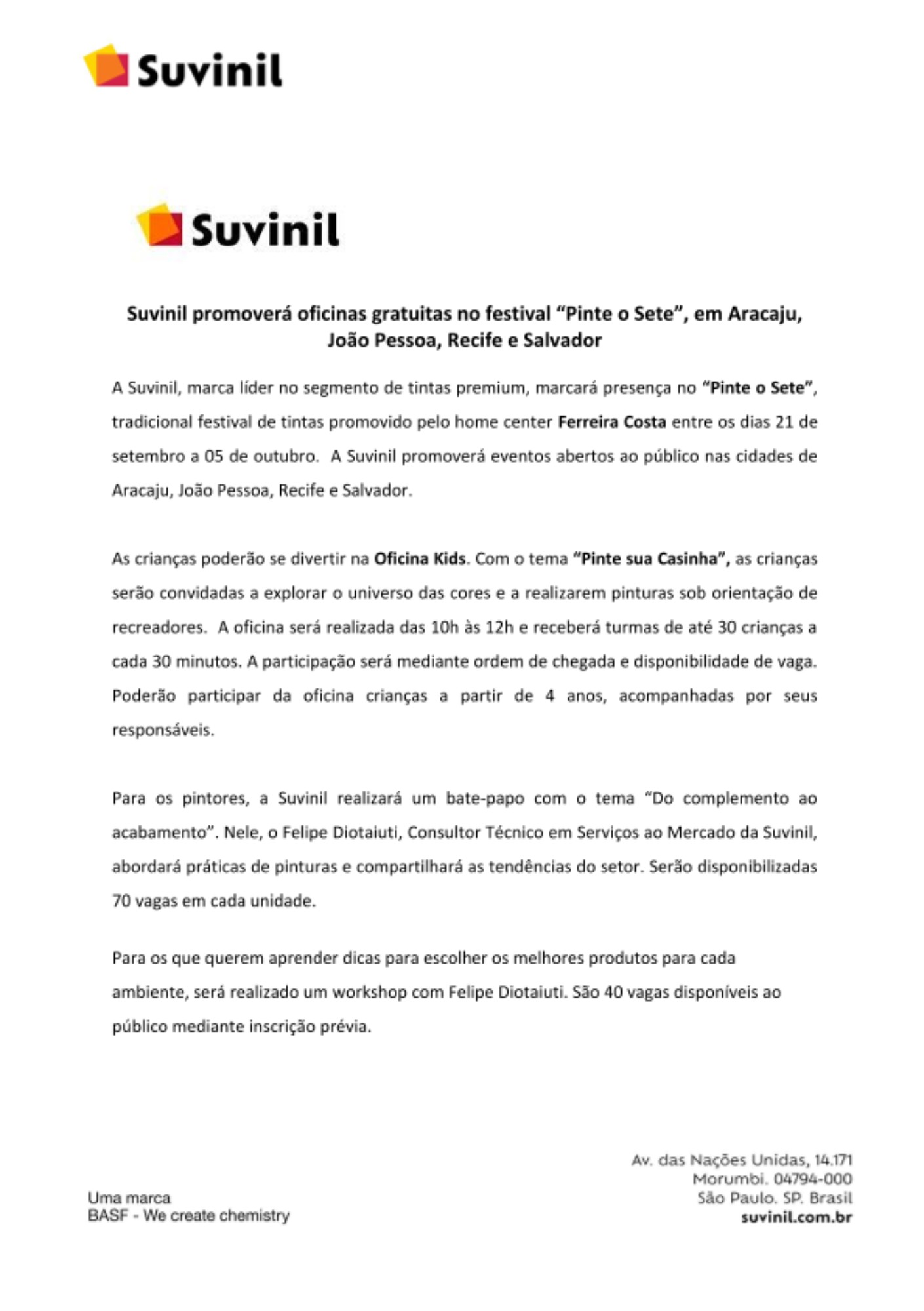 A Suvinil, marca líder no segmento de tintas premium, marcará presença no “Pinte o Sete”, tradicional festival de tintas promovido pelo home center Ferreira Costa entre os dias 21 de setembro a 05 de outubro. A Suvinil promoverá eventos abertos ao público nas cidades de Aracaju, João Pessoa, Recife e Salvador.