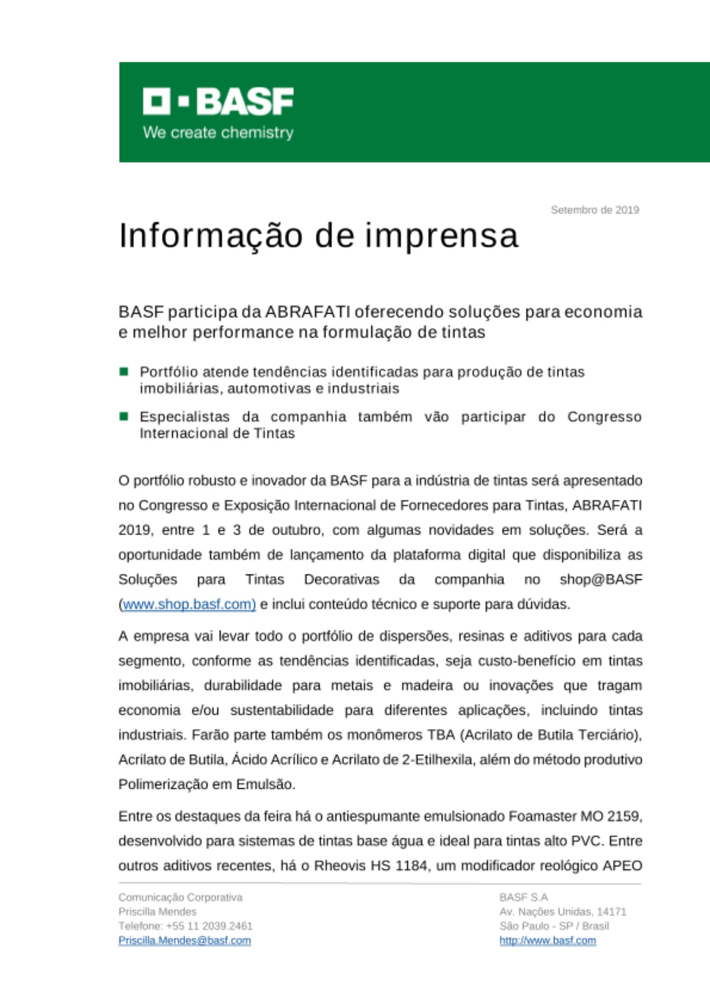 O portfólio robusto e inovador da BASF para a indústria de tintas será apresentado no Congresso e Exposição Internacional de Fornecedores para Tintas, ABRAFATI 2019, entre 1 e 3 de outubro, com algumas novidades em soluções. Será a oportunidade também de lançamento da plataforma digital que disponibiliza as Soluções para Tintas Decorativas da companhia no shop@BASF (www.shop.basf.com) e inclui conteúdo técnico e suporte para dúvidas.