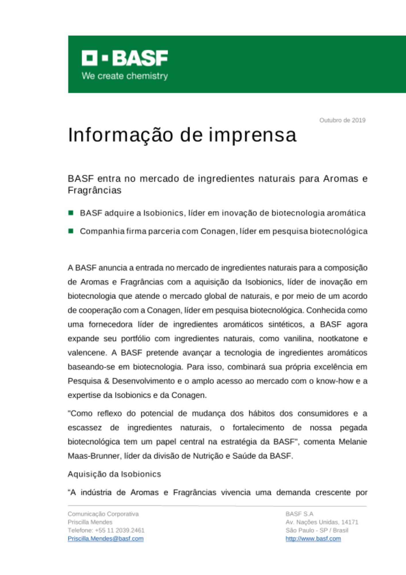 A BASF anuncia a entrada no mercado de ingredientes naturais para a composição de Aromas e Fragrâncias com a aquisição da Isobionics, líder de inovação em biotecnologia que atende o mercado global de naturais, e por meio de um acordo de cooperação com a Conagen, líder em pesquisa biotecnológica. Conhecida como uma fornecedora líder de ingredientes aromáticos sintéticos, a BASF agora expande seu portfólio com ingredientes naturais, como vanilina, nootkatone e valencene. A BASF pretende avançar a tecnologia de ingredientes aromáticos baseando-se em biotecnologia. Para isso, combinará sua própria excelência em Pesquisa & Desenvolvimento e o amplo acesso ao mercado com o know-how e a expertise da Isobionics e da Conagen.
