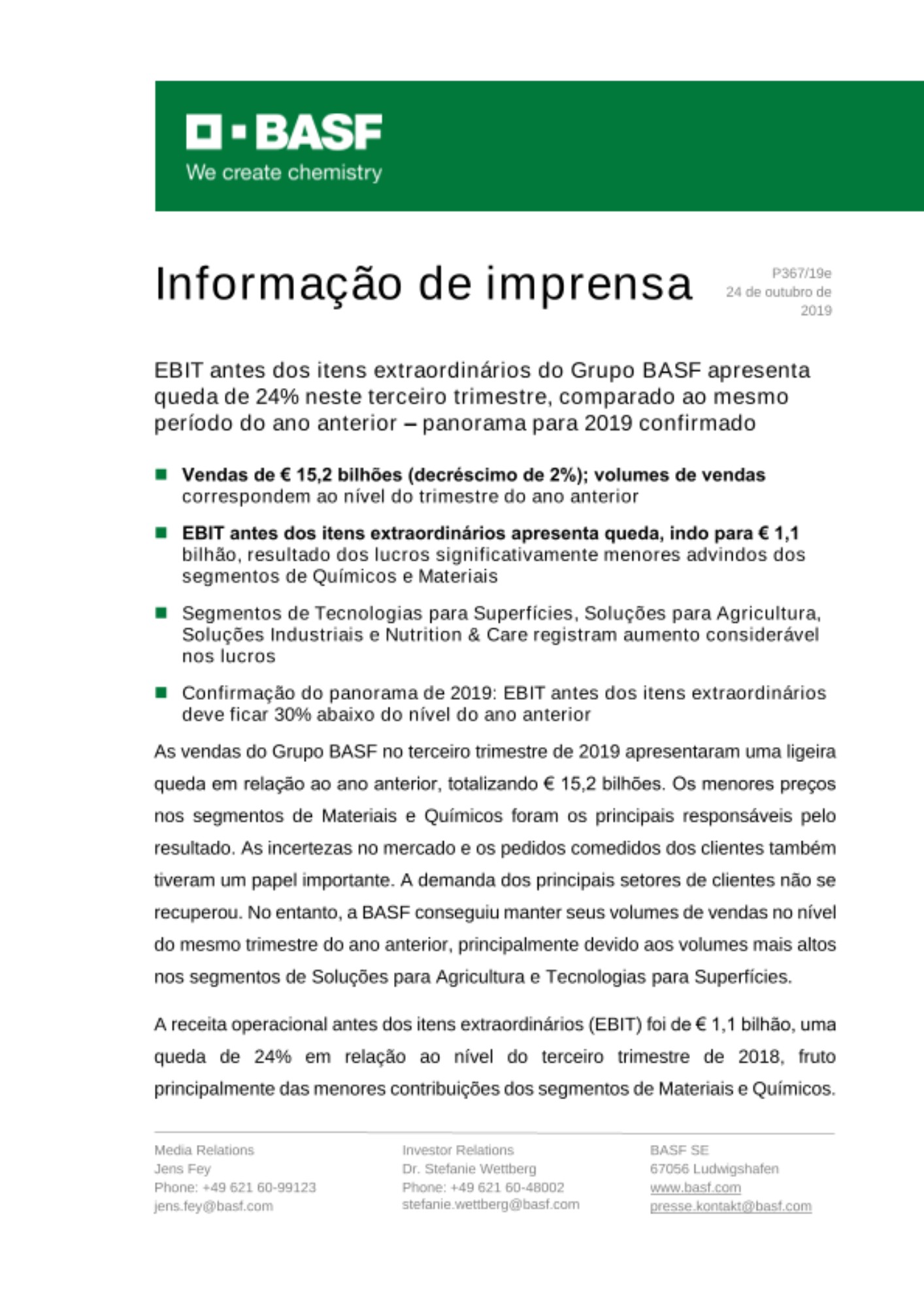 A receita operacional antes dos itens extraordinários (EBIT) foi de € 1,1 bilhão, uma queda de 24% em relação ao nível do terceiro trimestre de 2018, fruto principalmente das menores contribuições dos segmentos de Materiais e Químicos. Como esperado, os preços de isocianato caíram consideravelmente. Além disso, manutenções programadas foram realizadas nos craqueamentos a vapor e os produtos desses equipamentos apresentaram queda nas margens. Tais fatores contribuíram negativamente para os lucros nos dois segmentos. "Em nossas divisões mais próximas do final da cadeia produtiva, tivemos maior êxito, apesar do difícil ambiente de mercado, e registramos uma melhoria considerável em relação ao mesmo trimestre do ano anterior", disse o Dr. Martin Brudermüller, Presidente do Conselho Administrativo da BASF SE, na apresentação dos resultados financeiros do terceiro trimestre de 2019.