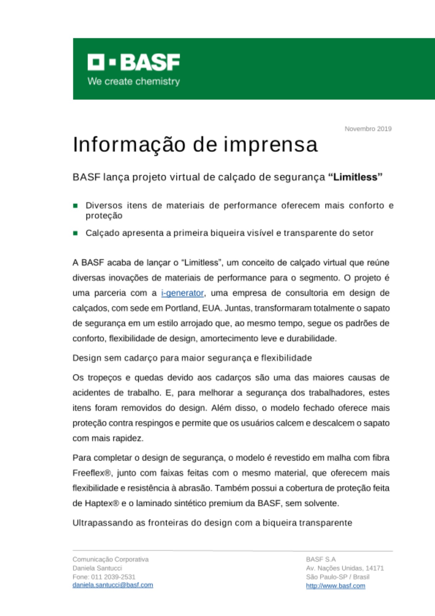 “Atualmente, os consumidores buscam looks mais leves e esportivos, mas, ao mesmo tempo, priorizam o conforto e a segurança” disse Gerd Manz, vice-presidente de Novos Mercados e do negócio de Materiais de Performance. “Apesar do modelo ainda só existir virtualmente, temos a certeza de que a divisão de materiais de performance da BASF pode abrir novas possibilidades de design e incentivar as marcas de calçados de segurança”.
