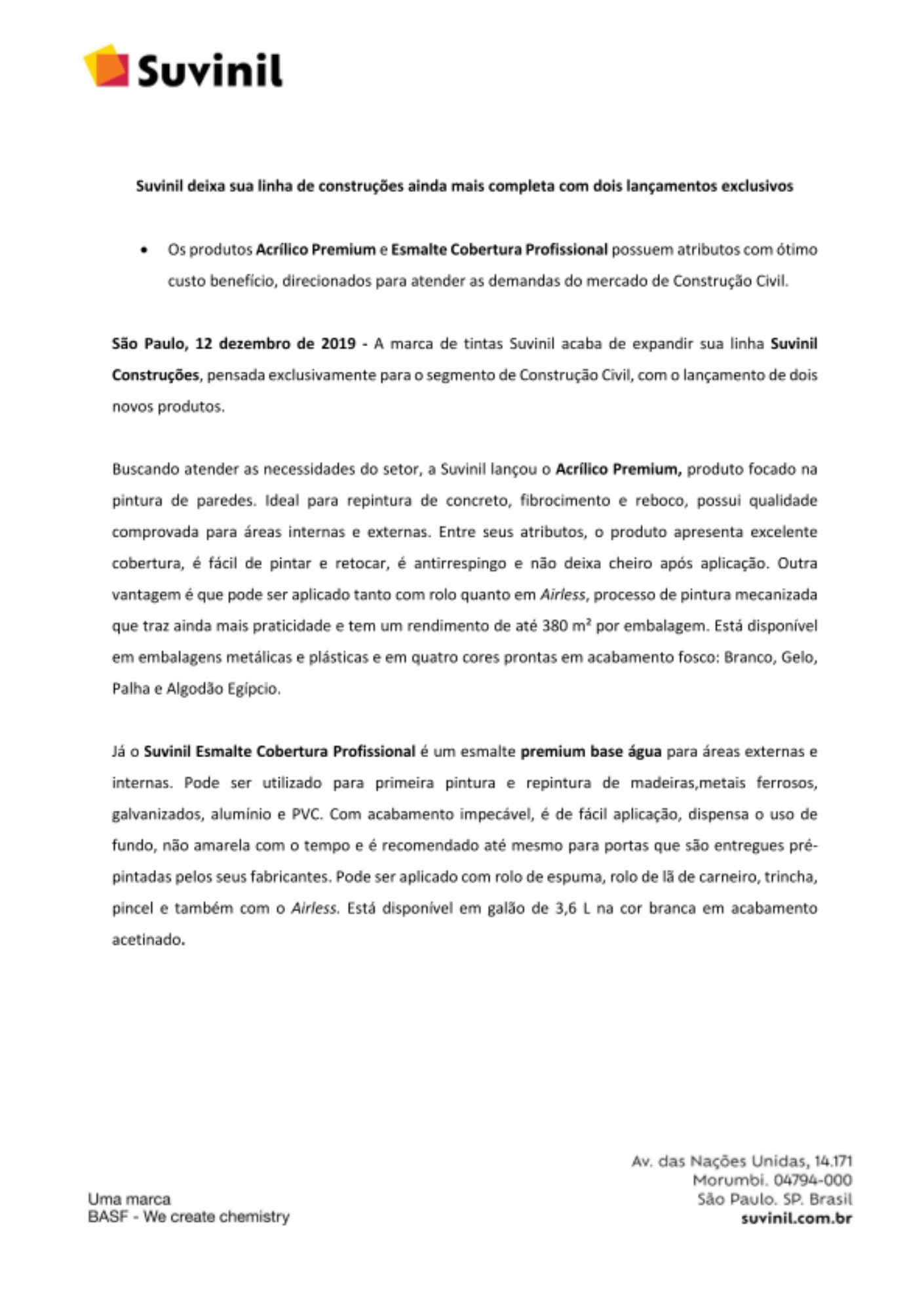 Buscando atender as necessidades do setor, a Suvinil lançou o Acrílico Premium, produto focado na pintura de paredes. Ideal para repintura de concreto, fibrocimento e reboco, possui qualidade comprovada para áreas internas e externas. Entre seus atributos, o produto apresenta excelente cobertura, é fácil de pintar e retocar, é antirrespingo e não deixa cheiro após aplicação. Outra vantagem é que pode ser aplicado tanto com rolo quanto em Airless, processo de pintura mecanizada que traz ainda mais praticidade e tem um rendimento de até 380 m² por embalagem. Está disponível em embalagens metálicas e plásticas e em quatro cores prontas em acabamento fosco: Branco, Gelo, Palha e Algodão Egípcio.