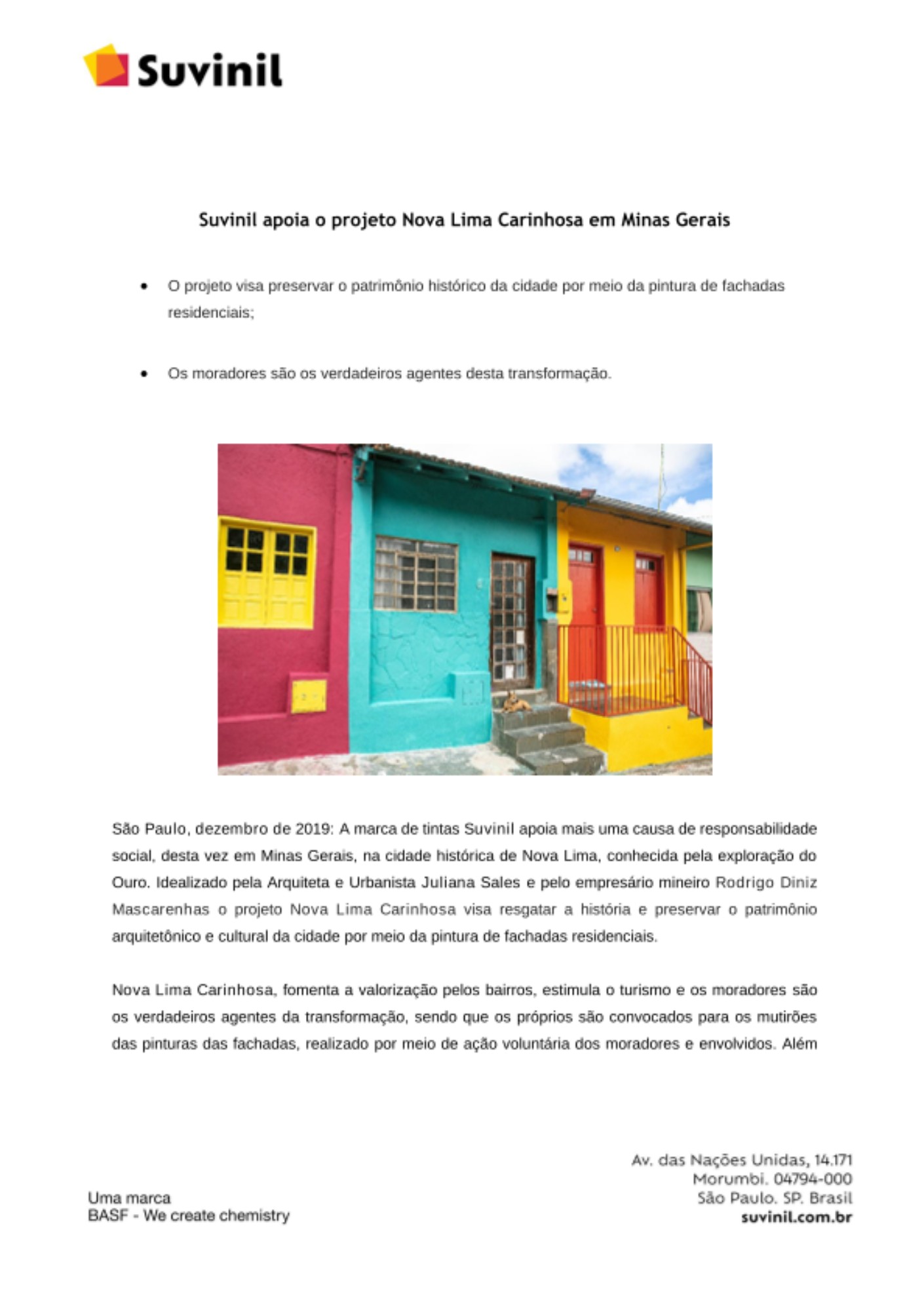 A marca de tintas Suvinil apoia mais uma causa de responsabilidade social, desta vez em Minas Gerais, na cidade histórica de Nova Lima, conhecida pela exploração do Ouro. Idealizado pela Arquiteta e Urbanista Juliana Sales e pelo empresário mineiro Rodrigo Diniz Mascarenhas o projeto Nova Lima Carinhosa visa resgatar a história e preservar o patrimônio arquitetônico e cultural da cidade por meio da pintura de fachadas residenciais.