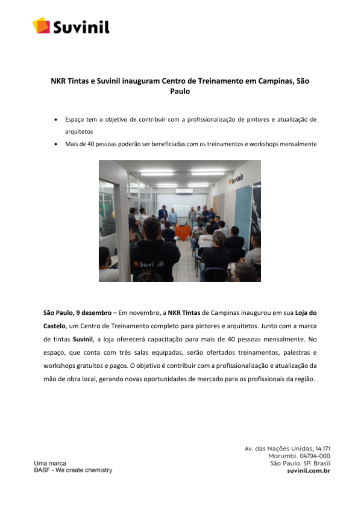 Em novembro, a NKR Tintas de Campinas inaugurou em sua Loja do Castelo, um Centro de Treinamento completo para pintores e arquitetos. Junto com a marca de tintas Suvinil, a loja oferecerá capacitação para mais de 40 pessoas mensalmente. No espaço, que conta com três salas equipadas, serão ofertados treinamentos, palestras e workshops gratuitos e pagos. O objetivo é contribuir com a profissionalização e atualização da mão de obra local, gerando novas oportunidades de mercado para os profissionais da região.