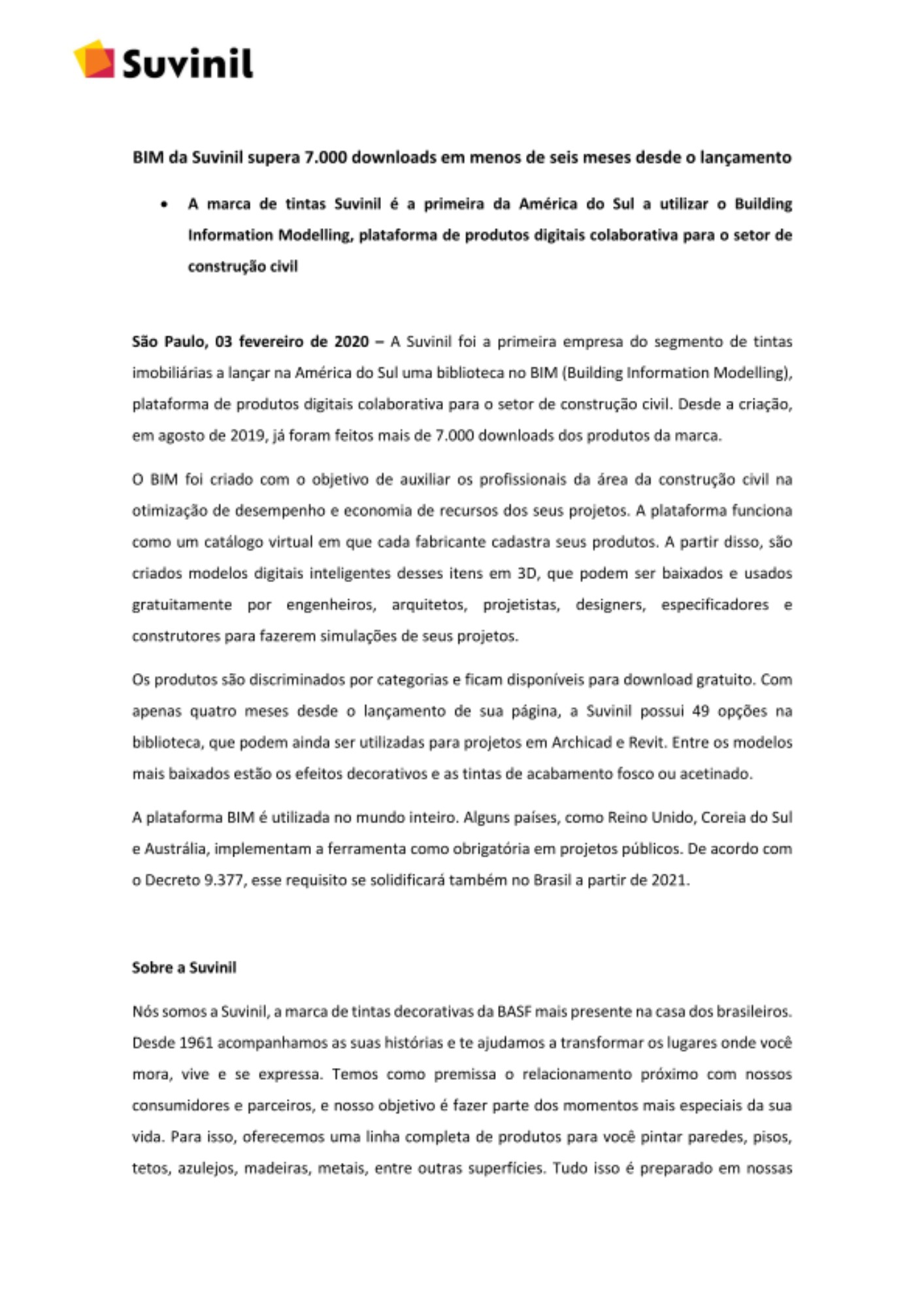 A Suvinil foi a primeira empresa do segmento de tintas imobiliárias a lançar na América do Sul uma biblioteca no BIM (Building Information Modelling), plataforma de produtos digitais colaborativa para o setor de construção civil. Desde a criação, em agosto de 2019, já foram feitos mais de 7.000 downloads dos produtos da marca.