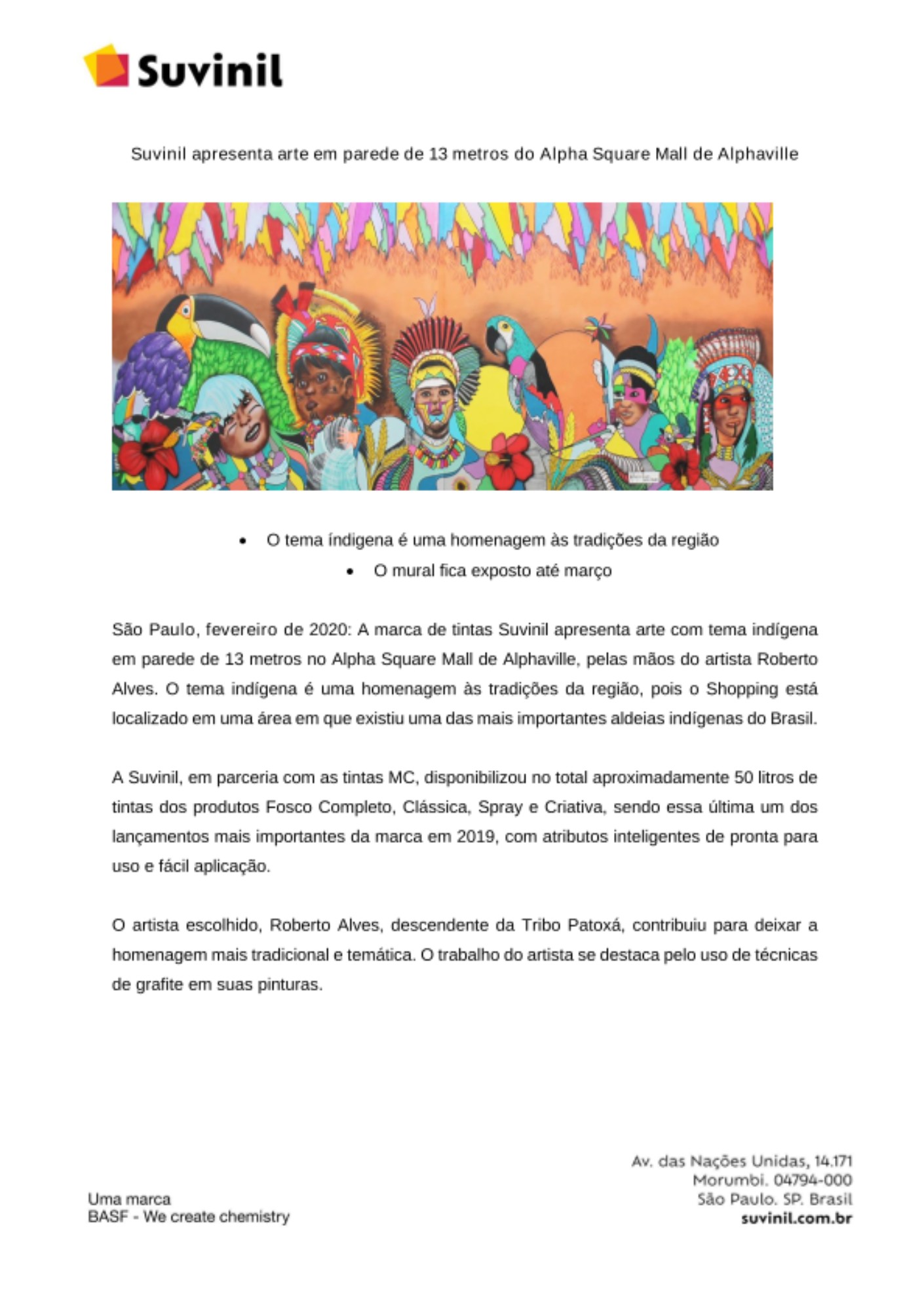 A marca de tintas Suvinil apresenta arte com tema indígena em parede de 13 metros no Alpha Square Mall de Alphaville, pelas mãos do artista Roberto Alves. O tema indígena é uma homenagem às tradições da região, pois o Shopping está localizado em uma área em que existiu uma das mais importantes aldeias indígenas do Brasil.