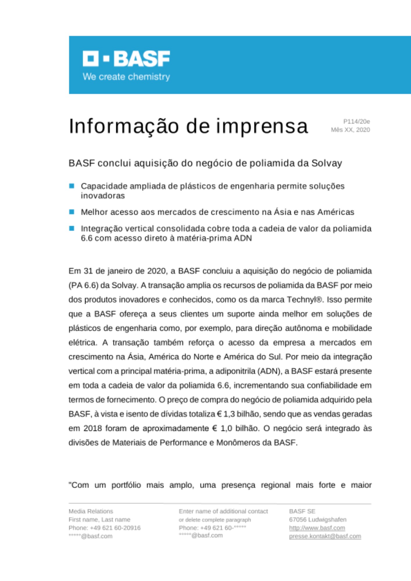 Em 31 de janeiro de 2020, a BASF concluiu a aquisição do negócio de poliamida (PA 6.6) da Solvay. A transação amplia os recursos de poliamida da BASF por meio dos produtos inovadores e conhecidos, como os da marca Technyl®. Isso permite que a BASF ofereça a seus clientes um suporte ainda melhor em soluções de plásticos de engenharia como, por exemplo, para direção autônoma e mobilidade elétrica. A transação também reforça o acesso da empresa a mercados em crescimento na Ásia, América do Norte e América do Sul. Por meio da integração vertical com a principal matéria-prima, a adiponitrila (ADN), a BASF estará presente em toda a cadeia de valor da poliamida 6.6, incrementando sua confiabilidade em termos de fornecimento. O preço de compra do negócio de poliamida adquirido pela BASF, à vista e isento de dívidas totaliza € 1,3 bilhão, sendo que as vendas geradas em 2018 foram de aproximadamente € 1,0 bilhão. O negócio será integrado às divisões de Materiais de Performance e Monômeros da BASF.