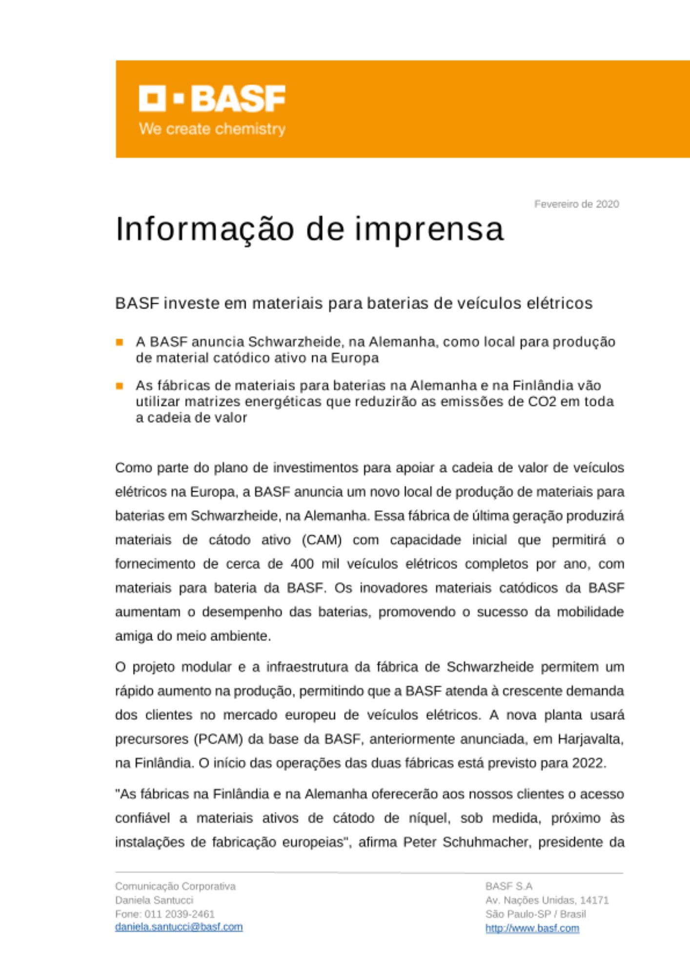 - A BASF anuncia Schwarzheide, na Alemanha, como local para produção de material catódico ativo na Europa