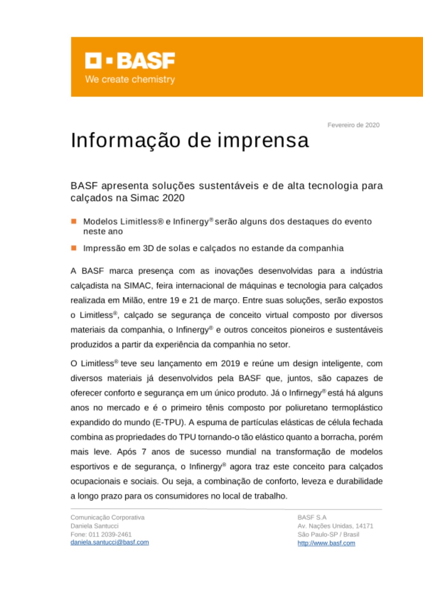 A BASF marca presença com as inovações desenvolvidas para a indústria calçadista na SIMAC, feira internacional de máquinas e tecnologia para calçados realizada em Milão, entre 19 e 21 de março. Entre suas soluções, serão expostos o Limitless®, calçado se segurança de conceito virtual composto por diversos materiais da companhia, o Infinergy® e outros conceitos pioneiros e sustentáveis produzidos a partir da experiência da companhia no setor.