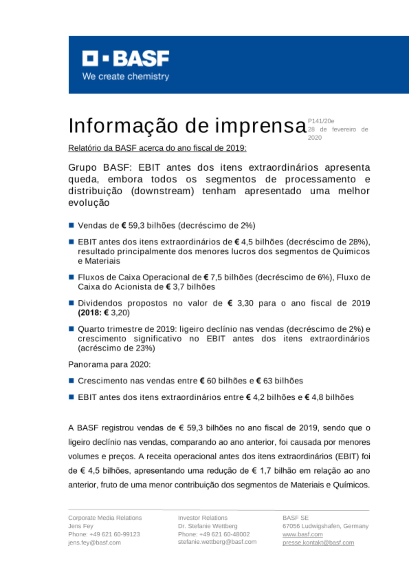 “A BASF apresentou uma boa performance, mesmo em tempos difíceis. O ano de 2019 foi desafiador, com grandes turbulências econômicas globais”, comentou o presidente da Junta Diretiva da BASF, Dr. Martin Brudermüller, que apresentou os números financeiros de 2019 juntamente com o CFO Dr. Hans-Ulrich Engel. Os conflitos comerciais entre os Estados Unidos e a China tiveram um impacto negativo. Os principais mercados de vendas evoluíram mais lentamente, intensificado pelas incertezas relacionadas ao Brexit. O crescimento da produção industrial e química foi significativamente mais lento do que o esperado. A demanda de muitas indústrias de clientes importantes, especialmente do setor automotivo, diminuiu consideravelmente.