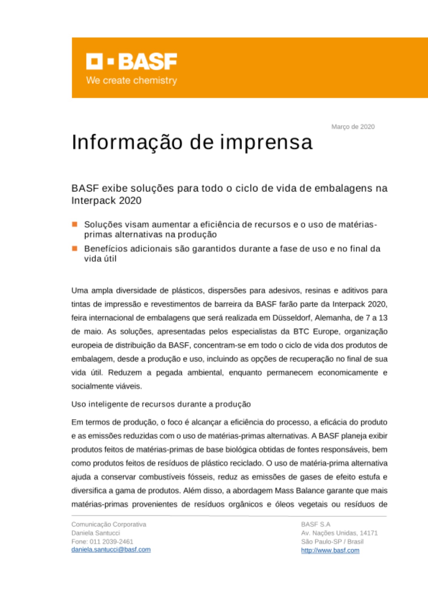 Há dados adicionais nos links: BASF na Interpack 2020, sobre o portfólio de produtos: basf.com/interpack2020