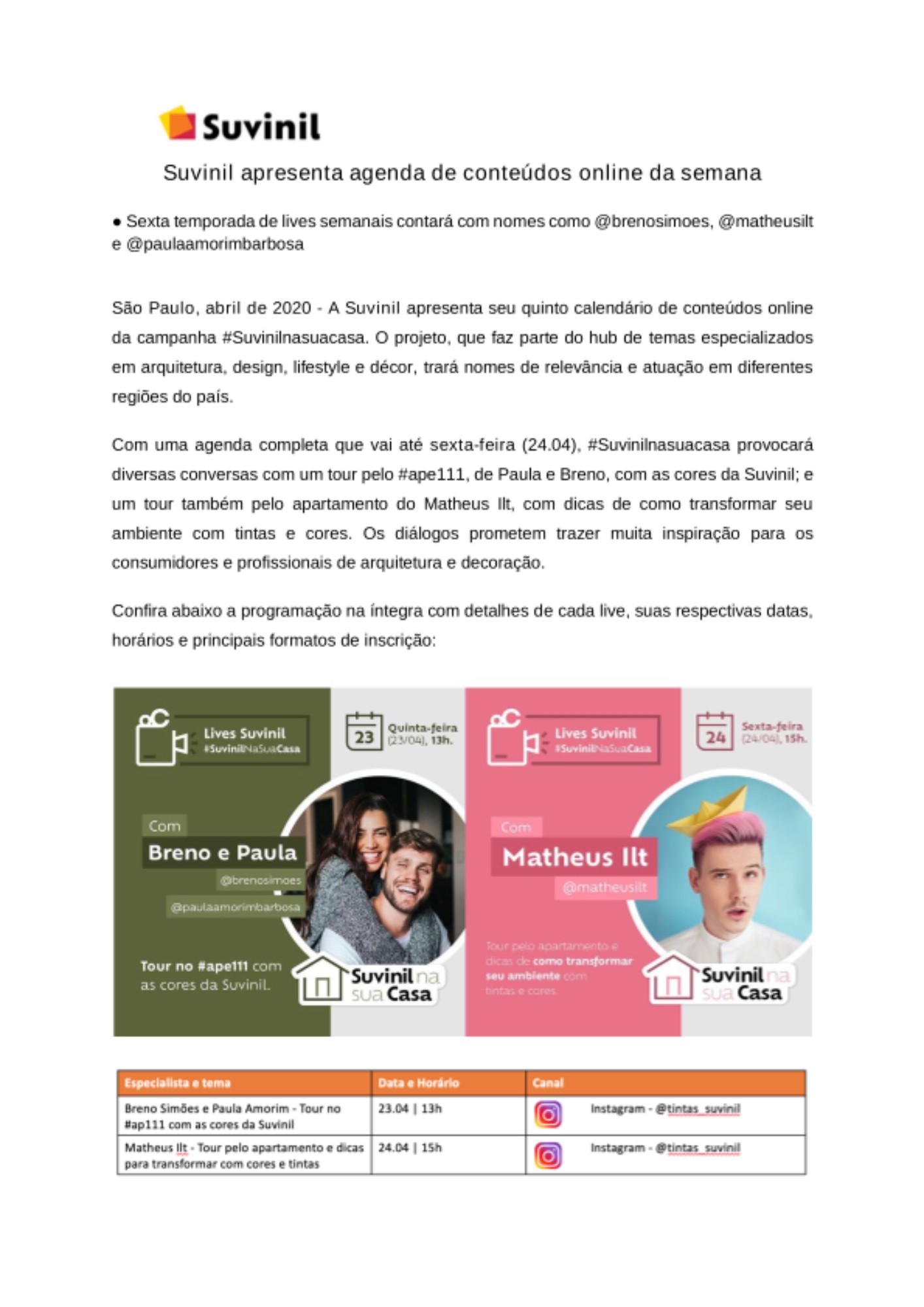 Com uma agenda completa que vai até sexta-feira (24.04), #Suvinilnasuacasa provocará diversas conversas com um tour pelo #ape111, de Paula e Breno, com as cores da Suvinil; e um tour também pelo apartamento do Matheus Ilt, com dicas de como transformar seu ambiente com tintas e cores. Os diálogos prometem trazer muita inspiração para os consumidores e profissionais de arquitetura e decoração.
