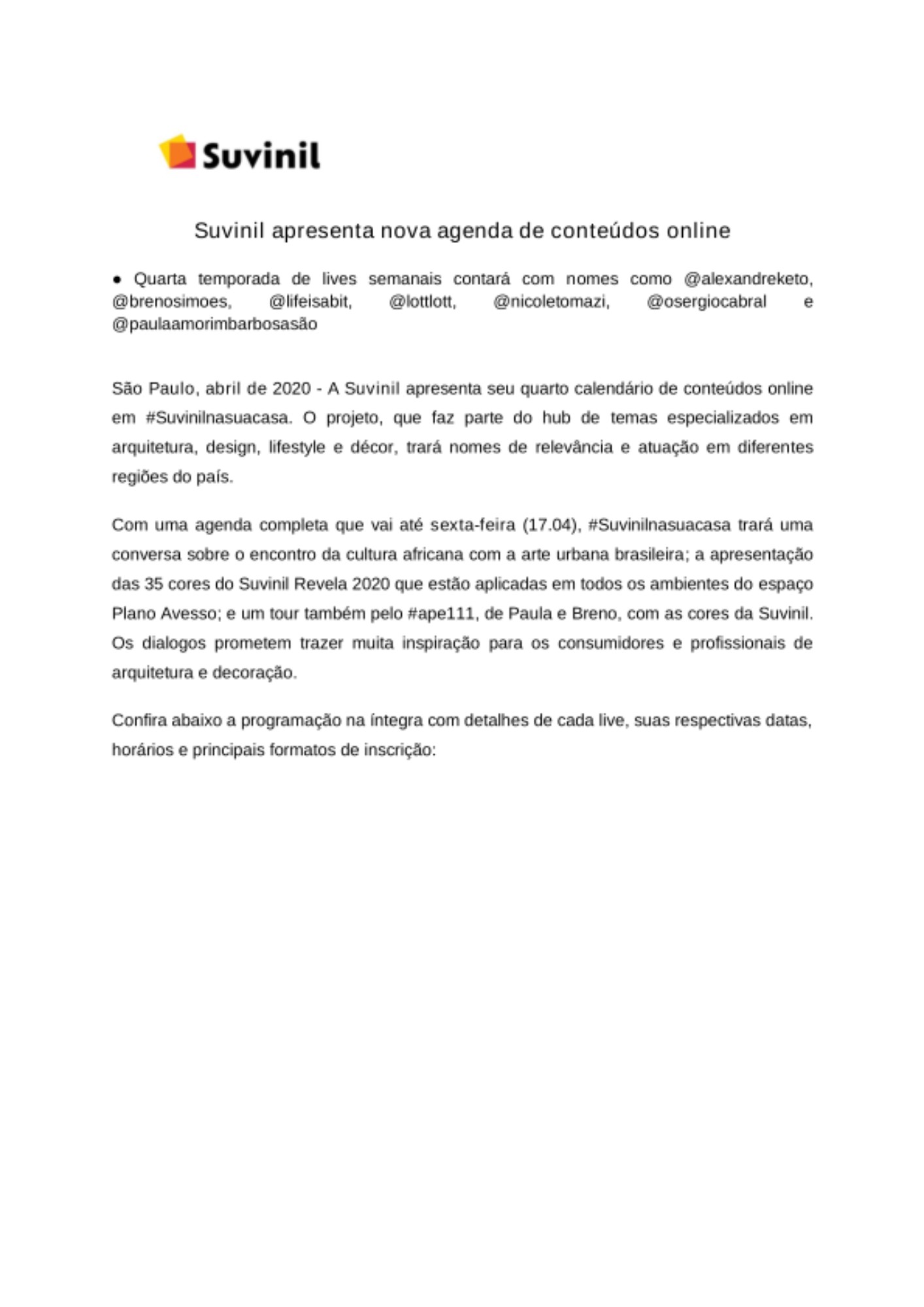 Com uma agenda completa que vai até sexta-feira (17.04), #Suvinilnasuacasa trará uma conversa sobre o encontro da cultura africana com a arte urbana brasileira; a apresentação das 35 cores do Suvinil Revela 2020 que estão aplicadas em todos os ambientes do espaço Plano Avesso; e um tour também pelo #ape111, de Paula e Breno, com as cores da Suvinil. Os dialogos prometem trazer muita inspiração para os consumidores e profissionais de arquitetura e decoração.