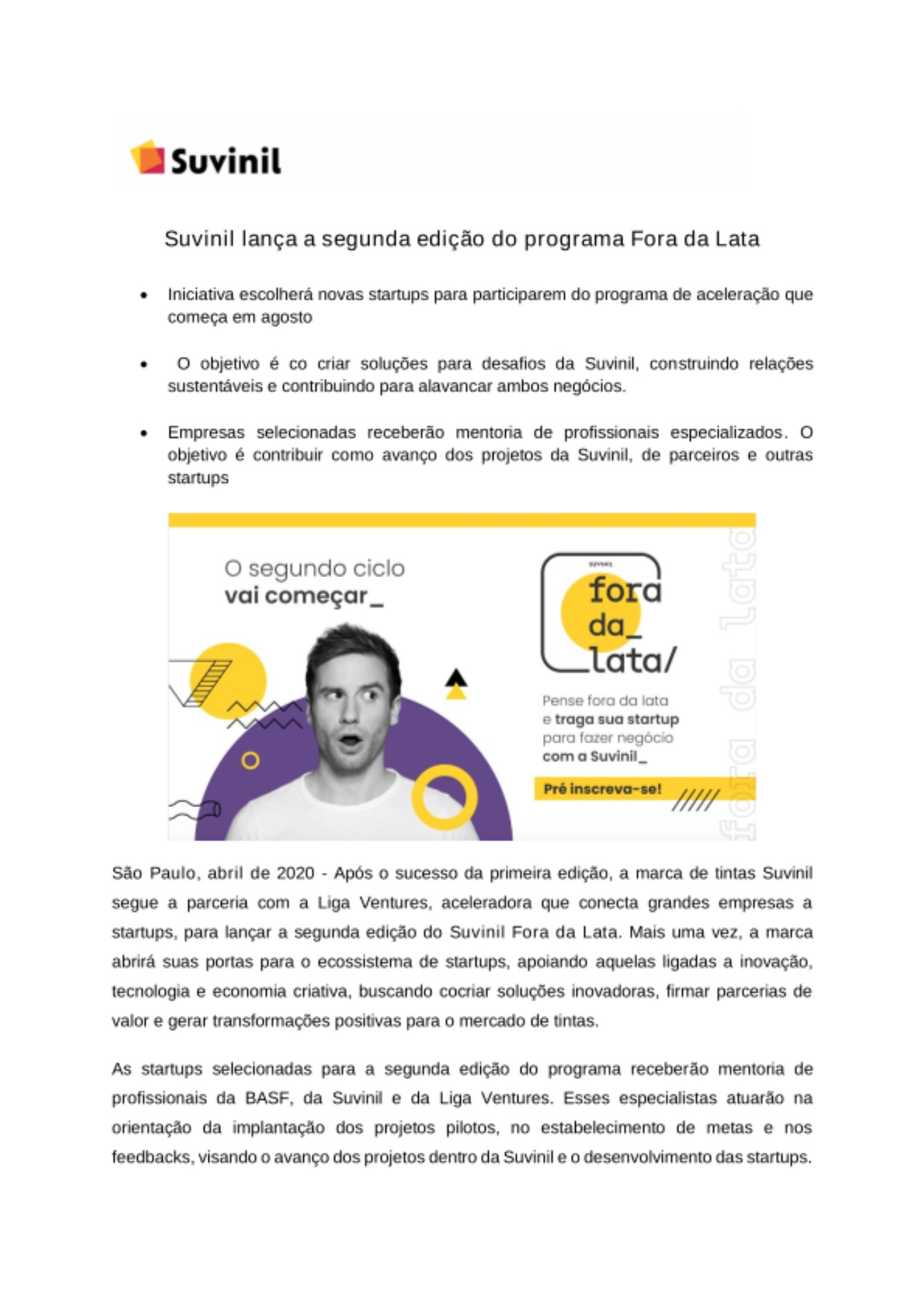 Após o sucesso da primeira edição, a marca de tintas Suvinil segue a parceria com a Liga Ventures, aceleradora que conecta grandes empresas a startups, para lançar a segunda edição do Suvinil Fora da Lata. Mais uma vez, a marca abrirá suas portas para o ecossistema de startups, apoiando aquelas ligadas a inovação, tecnologia e economia criativa, buscando cocriar soluções inovadoras, firmar parcerias de valor e gerar transformações positivas para o mercado de tintas.