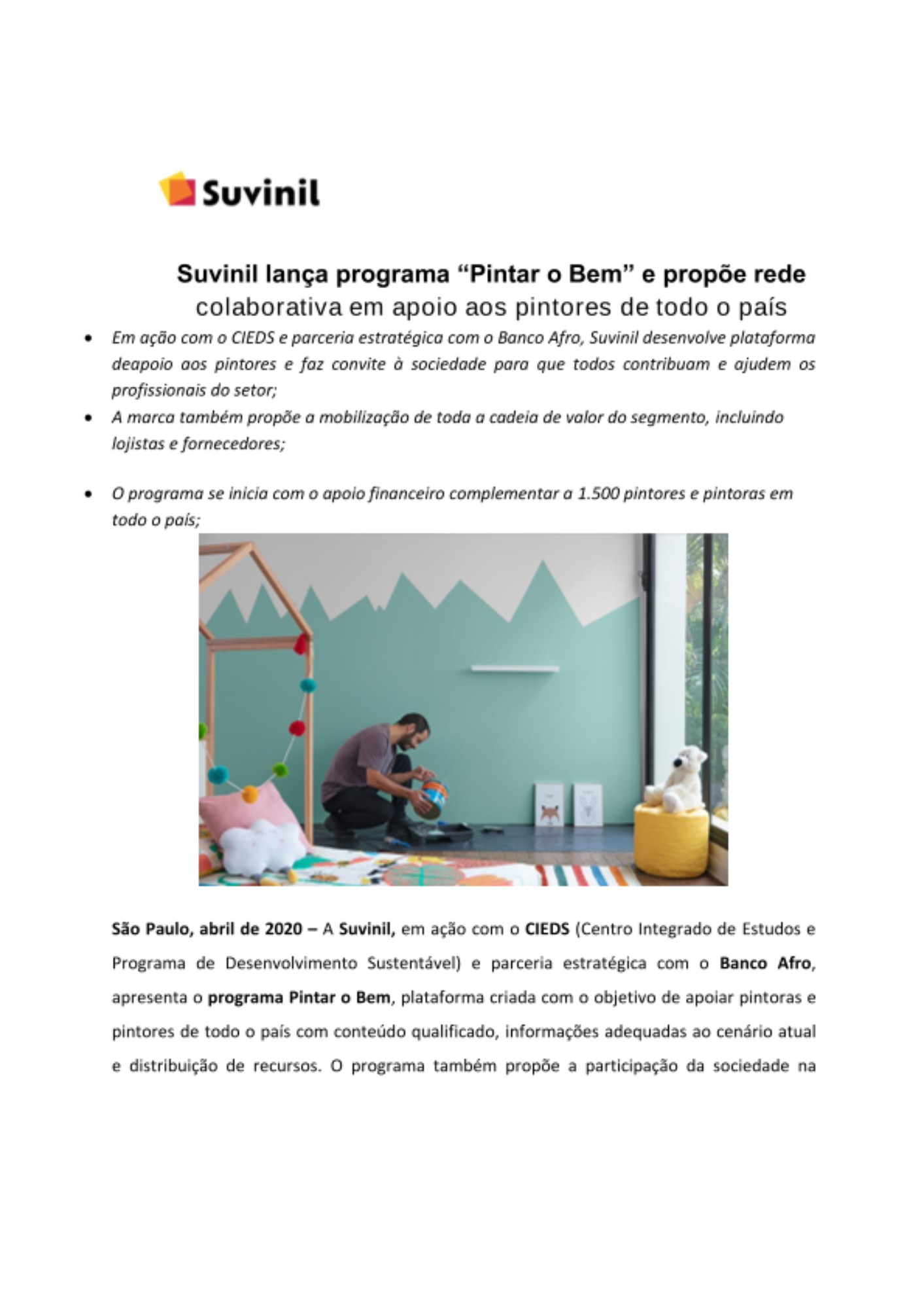 populações em situação de vulnerabilidade social em território nacional, com a definição dos elementos de análise e a governança dos principais processos de seleção. “Para o CIEDS construir esse programa com a Suvinil é promover um futuro melhor e com mais confiança para milhares de pintores e suas famílias. Estamos dando início a um programa que une tecnologia, inovação e alto impacto social e que nos permitirá, coletivamente, criar oportunidades novas e sustentáveis para que possamos passar por este momento e voltar a viver dias mais coloridos. Essa iniciativa é um pontapé inicial e esperamos que outros parceiros se juntem nessa ação de Pintar o Bem.”, diz Vandré Brilhante, Diretor-Presidente do CIEDS.