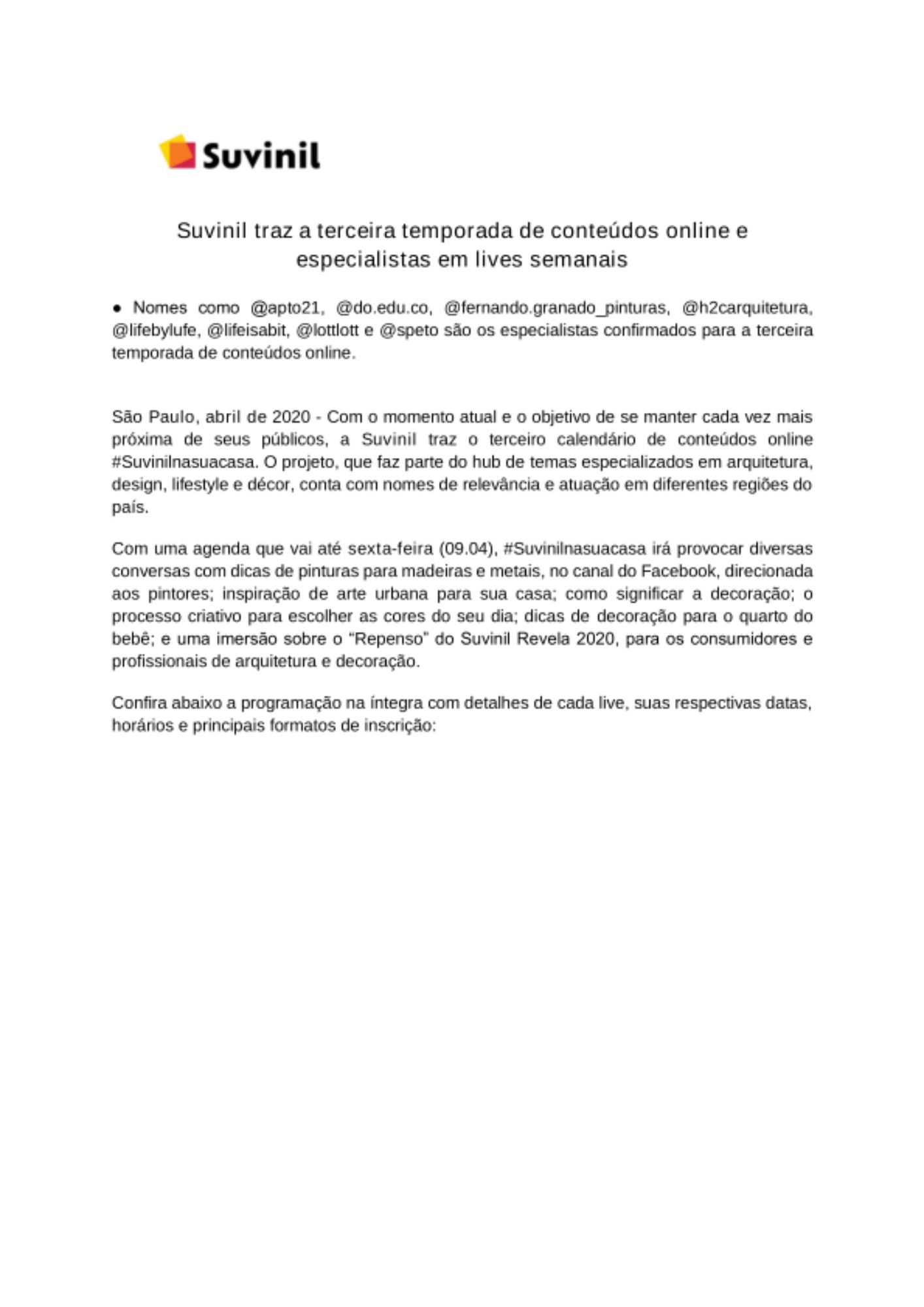 Com o momento atual e o objetivo de se manter cada vez mais próxima de seus públicos, a Suvinil traz o terceiro calendário de conteúdos online #Suvinilnasuacasa. O projeto, que faz parte do hub de temas especializados em arquitetura, design, lifestyle e décor, conta com nomes de relevância e atuação em diferentes regiões do país.