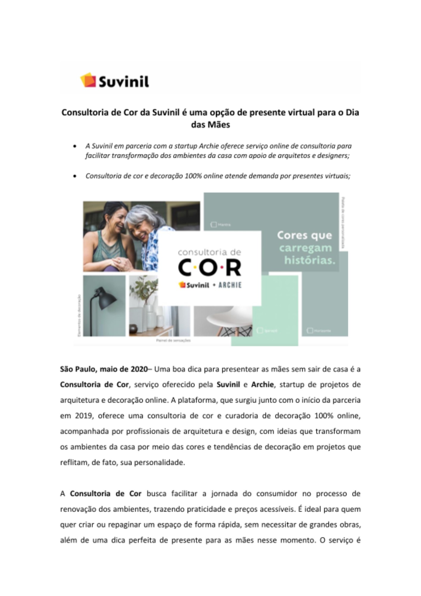 Uma boa dica para presentear as mães sem sair de casa é a Consultoria de Cor, serviço oferecido pela Suvinil e Archie, startup de projetos de arquitetura e decoração online. A plataforma, que surgiu junto com o início da parceria em 2019, oferece uma consultoria de cor e curadoria de decoração 100% online, acompanhada por profissionais de arquitetura e design, com ideias que transformam os ambientes da casa por meio das cores e tendências de decoração em projetos que reflitam, de fato, sua personalidade.