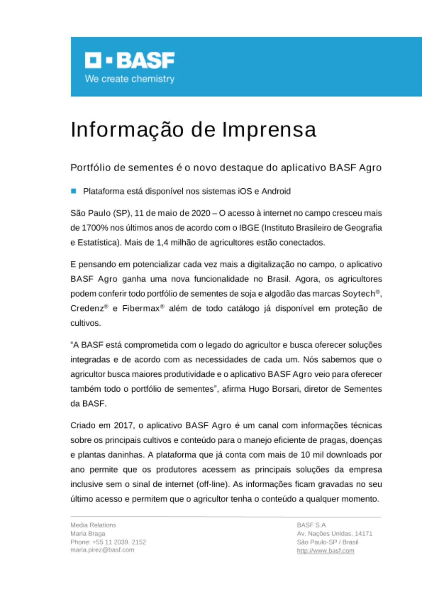 “A BASF está comprometida com o legado do agricultor e busca oferecer soluções integradas e de acordo com as necessidades de cada um. Nós sabemos que o agricultor busca maiores produtividade e o aplicativo BASF Agro veio para oferecer também todo o portfólio de sementes”, afirma Hugo Borsari, diretor de Sementes da BASF.
