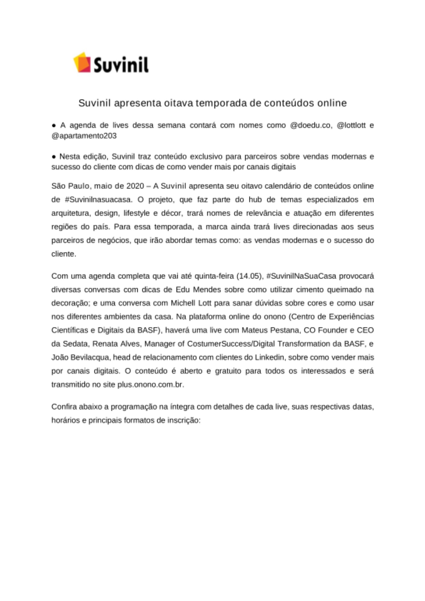 A Suvinil apresenta seu oitavo calendário de conteúdos online de #Suvinilnasuacasa. O projeto, que faz parte do hub de temas especializados em arquitetura, design, lifestyle e décor, trará nomes de relevância e atuação em diferentes regiões do país. Para essa temporada, a marca ainda trará lives direcionadas aos seus parceiros de negócios, que irão abordar temas como: as vendas modernas e o sucesso do cliente.