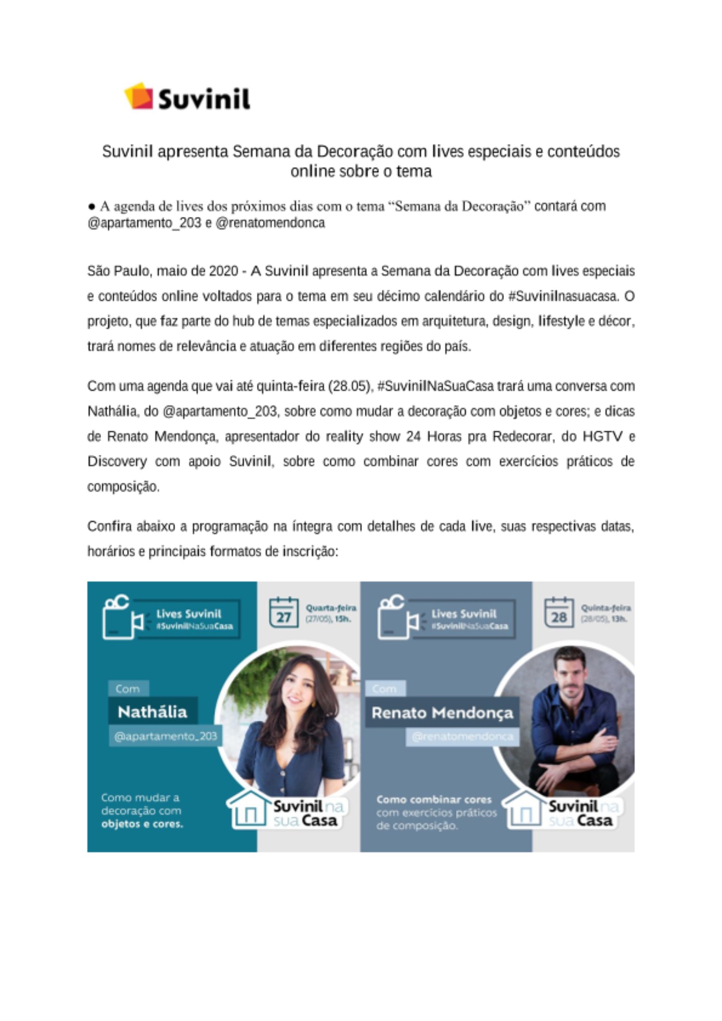 Com uma agenda que vai até quinta-feira (28.05), #SuvinilNaSuaCasa trará uma conversa com Nathália, do @apartamento_203, sobre como mudar a decoração com objetos e cores; e dicas de Renato Mendonça, apresentador do reality show 24 Horas pra Redecorar, do HGTV e Discovery com apoio Suvinil, sobre como combinar cores com exercícios práticos de composição.