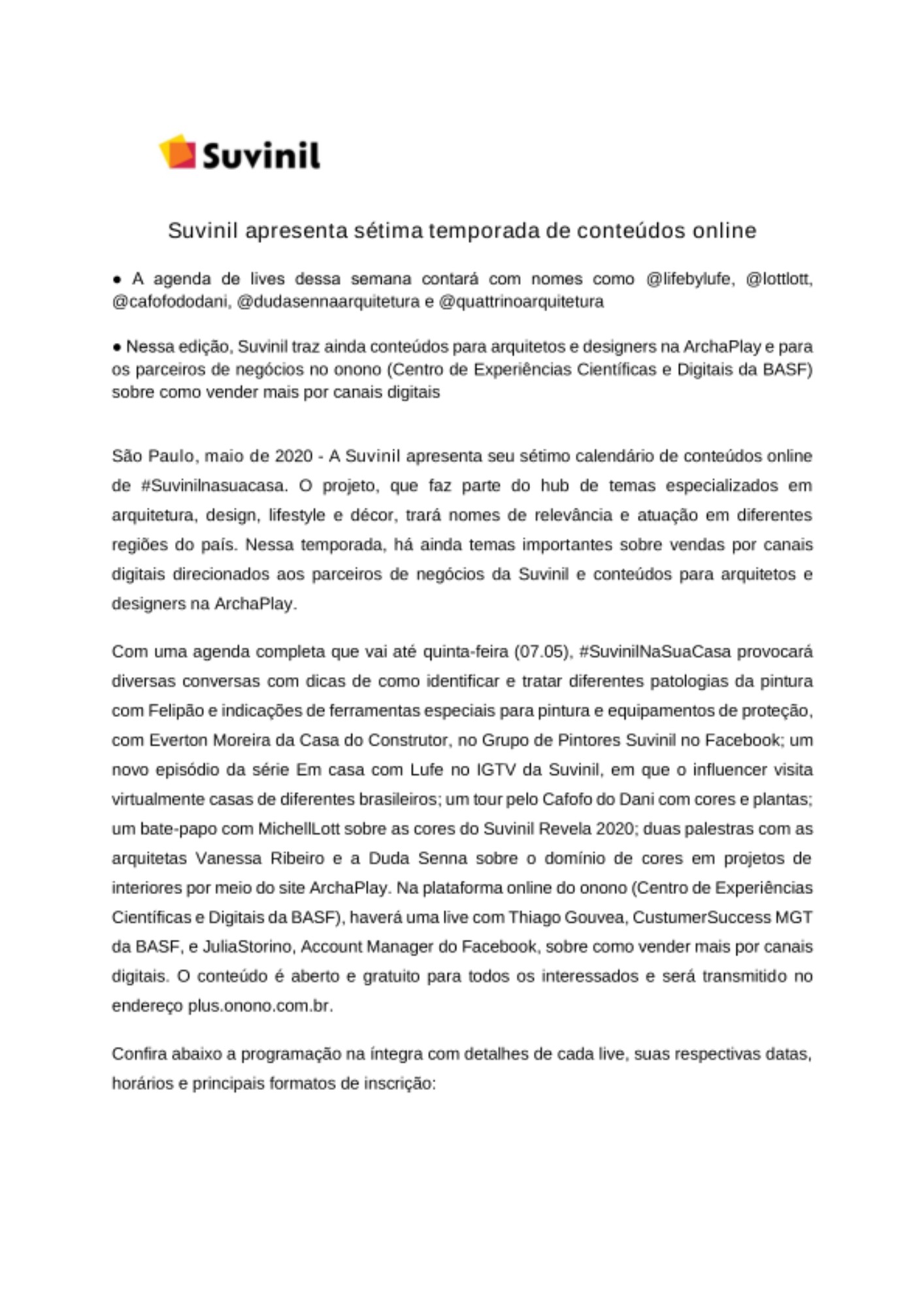 Com uma agenda completa que vai até quinta-feira (07.05), #SuvinilNaSuaCasa provocará diversas conversas com dicas de como identificar e tratar diferentes patologias da pintura com Felipão e indicações de ferramentas especiais para pintura e equipamentos de proteção, com Everton Moreira da Casa do Construtor, no Grupo de Pintores Suvinil no Facebook; um novo episódio da série Em casa com Lufe no IGTV da Suvinil, em que o influencer visita virtualmente casas de diferentes brasileiros; um tour pelo Cafofo do Dani com cores e plantas; um bate-papo com MichellLott sobre as cores do Suvinil Revela 2020; duas palestras com as arquitetas Vanessa Ribeiro e a Duda Senna sobre o domínio de cores em projetos de interiores por meio do site ArchaPlay. Na plataforma online do onono (Centro de Experiências Científicas e Digitais da BASF), haverá uma live com Thiago Gouvea, CustumerSuccess MGT da BASF, e JuliaStorino, Account Manager do Facebook, sobre como vender mais por canais digitais. O conteúdo é aberto e gratuito para todos os interessados e será transmitido no endereço plus.onono.com.br.
