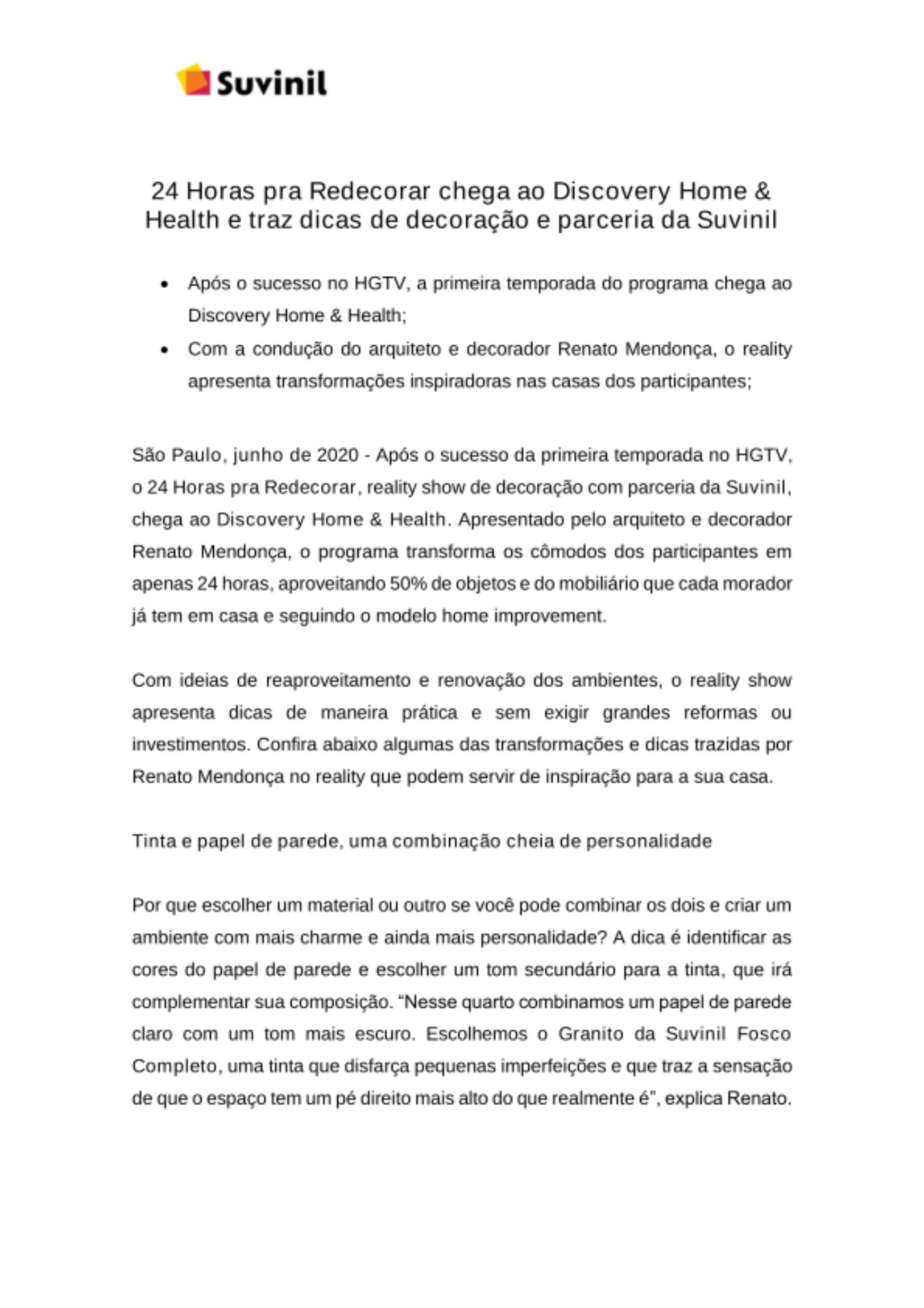 Após o sucesso da primeira temporada no HGTV, o 24 Horas pra Redecorar, reality show de decoração com parceria da Suvinil, chega ao Discovery Home & Health. Apresentado pelo arquiteto e decorador Renato Mendonça, o programa transforma os cômodos dos participantes em apenas 24 horas, aproveitando 50% de objetos e do mobiliário que cada morador já tem em casa e seguindo o modelo home improvement.
