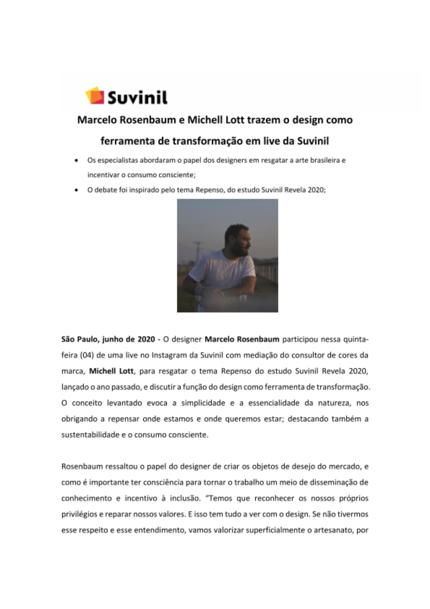 O designer Marcelo Rosenbaum participou nessa quinta- feira (04) de uma live no Instagram da Suvinil com mediação do consultor de cores da marca, Michell Lott, para resgatar o tema Repenso do estudo Suvinil Revela 2020, lançado o ano passado, e discutir a função do design como ferramenta de transformação. O conceito levantado evoca a simplicidade e a essencialidade da natureza, nos obrigando a repensar onde estamos e onde queremos estar; destacando também a sustentabilidade e o consumo consciente.