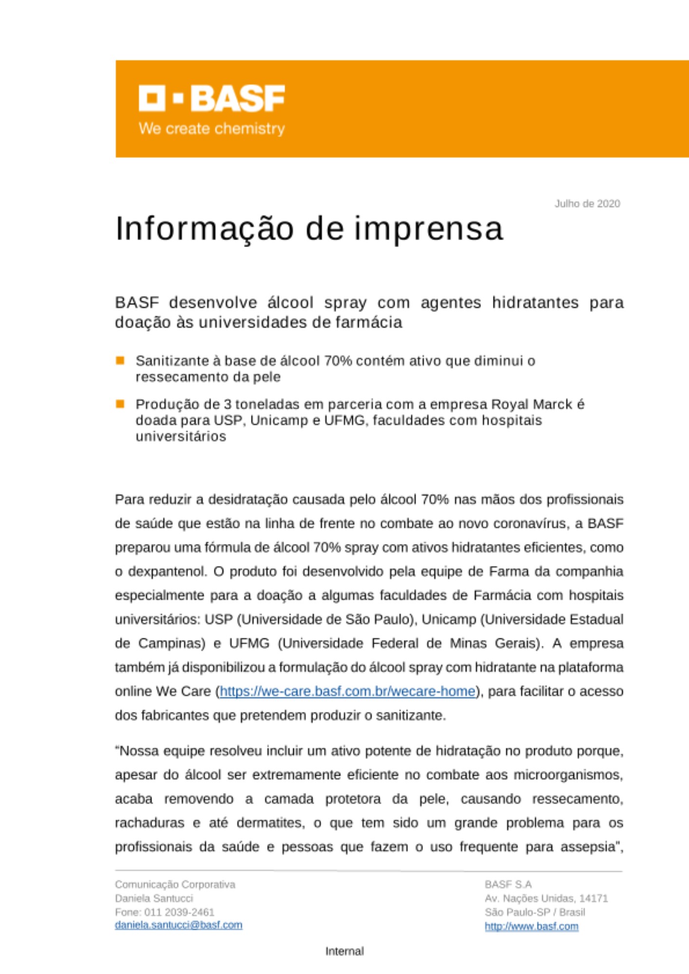 Para reduzir a desidratação causada pelo álcool 70% nas mãos dos profissionais de saúde que estão na linha de frente no combate ao novo coronavírus, a BASF preparou uma fórmula de álcool 70% spray com ativos hidratantes eficientes, como o dexpantenol. O produto foi desenvolvido pela equipe de Farma da companhia especialmente para a doação a algumas faculdades de Farmácia com hospitais universitários: USP (Universidade de São Paulo), Unicamp (Universidade Estadual de Campinas) e UFMG (Universidade Federal de Minas Gerais). A empresa também já disponibilizou a formulação do álcool spray com hidratante na plataforma online We Care (https://we-care.basf.com.br/wecare-home), para facilitar o acesso dos fabricantes que pretendem produzir o sanitizante.