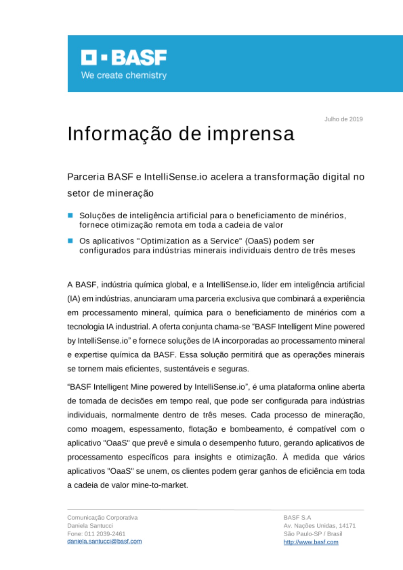 Para aqueles que procuram acelerar seus esforços de digitalização atuais, mais informações sobre a plataforma “BASF Intelligent Mine powered by IntelliSense.io”, podem ser encontradas em www.basfintellisense.io ou por meio de um representante da Soluções de Mineração da BASF.