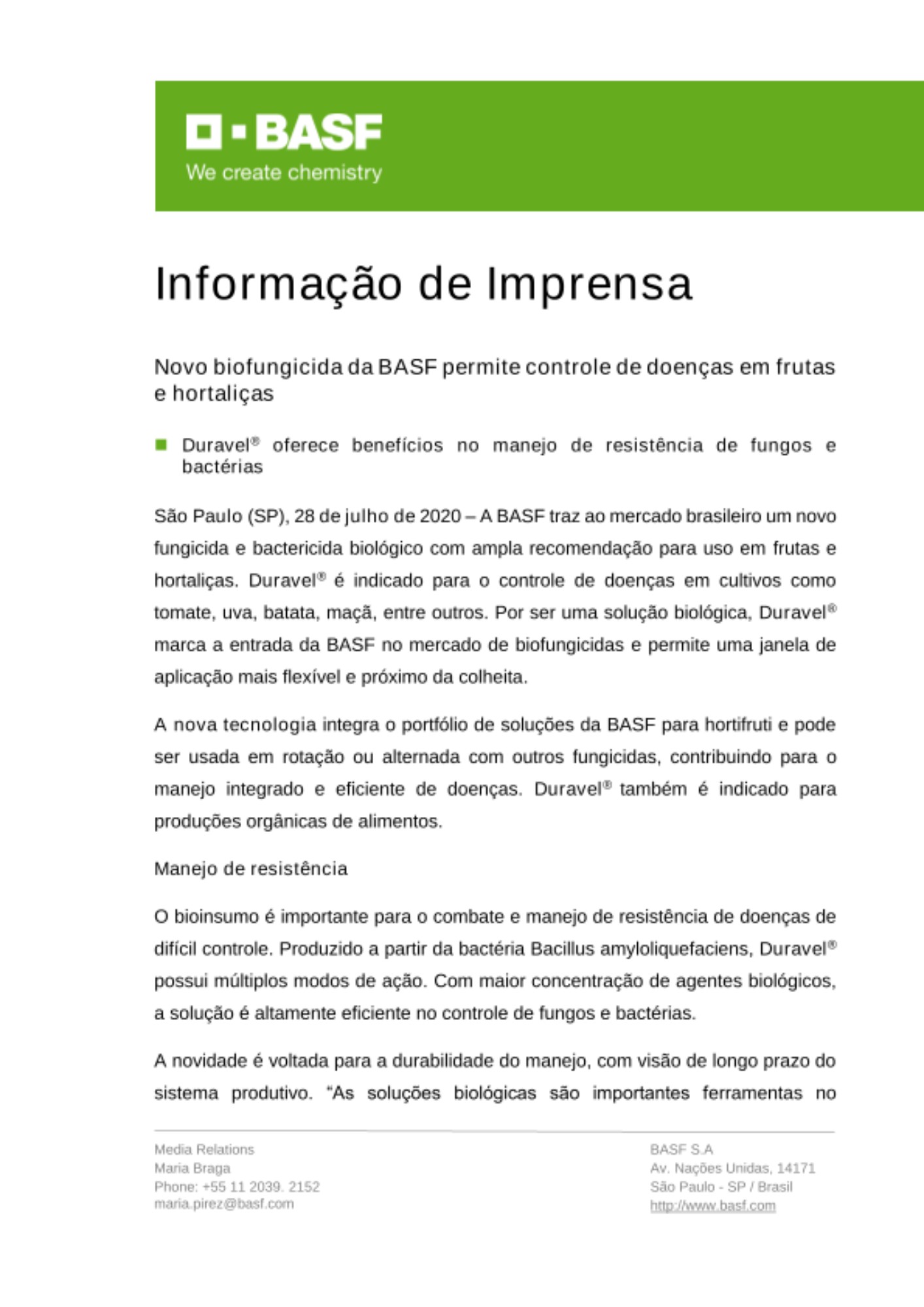 São Paulo (SP), 28 de julho de 2020 - A BASF oferece ao mercado brasileiro um novo fungicida e bactericida biológica com ampla recomendação para uso em frutas e hortaliças. Duravel ® é indicado para o controle de doenças em culturas como tomate, uva, batata, maçã, entre outros. Por uma solução biológica, o Duravel ® marca de entrada da BASF no mercado de biofungicidas e permite uma janela de aplicação mais flexível e a próxima colheita.